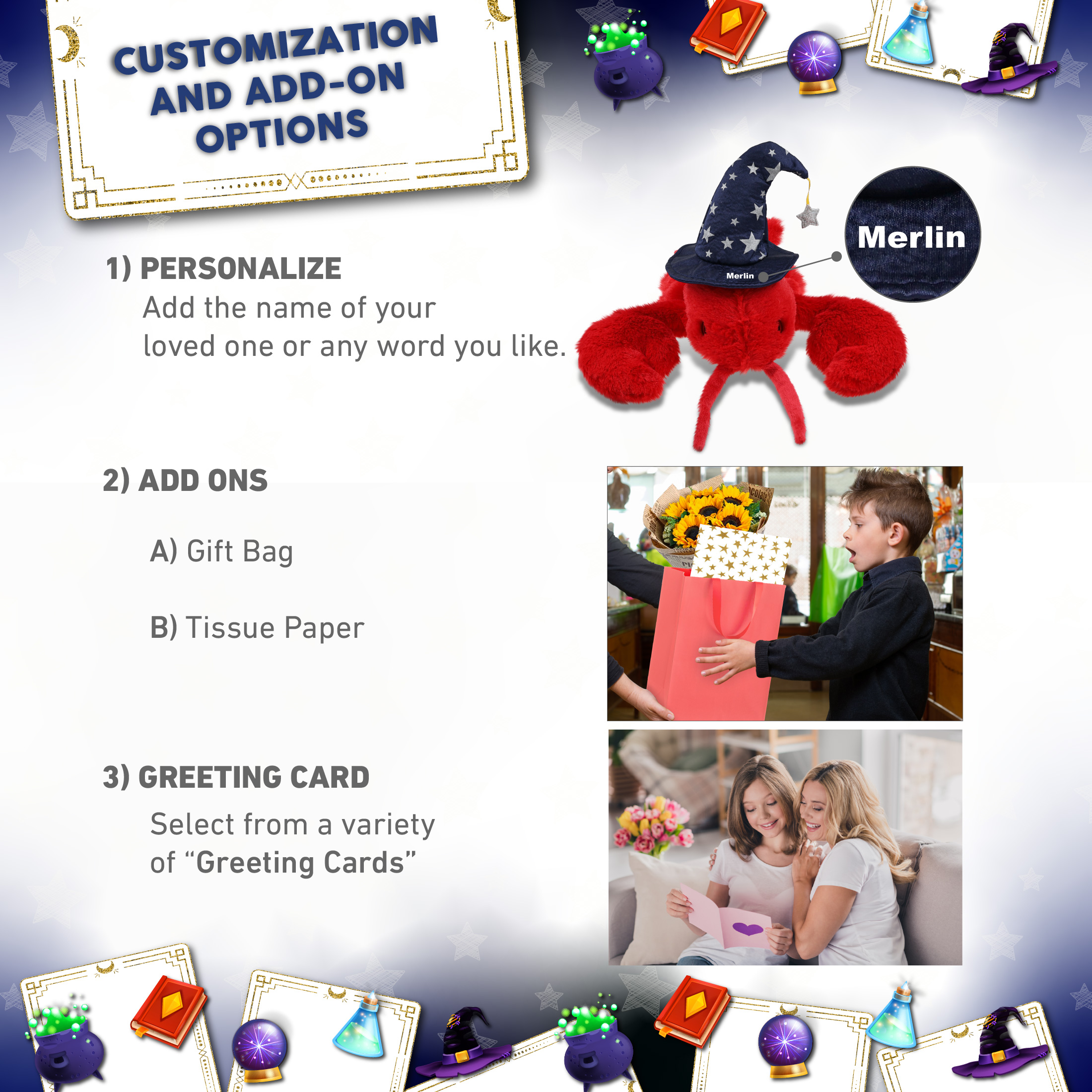 - Personalization, Customization, and Add-On Options – The red lobster stuffed animal comes in an enchanting wizard hat with silver star details. Make your wizard stuffed lobster special by adding a personalized name, which we will imprint onto the plush. You can customize your plush wizard toy by adding any of our add-ons to create the perfect gift: 1) Gift Bag 2) Tissue Paper 3) Greeting Card.