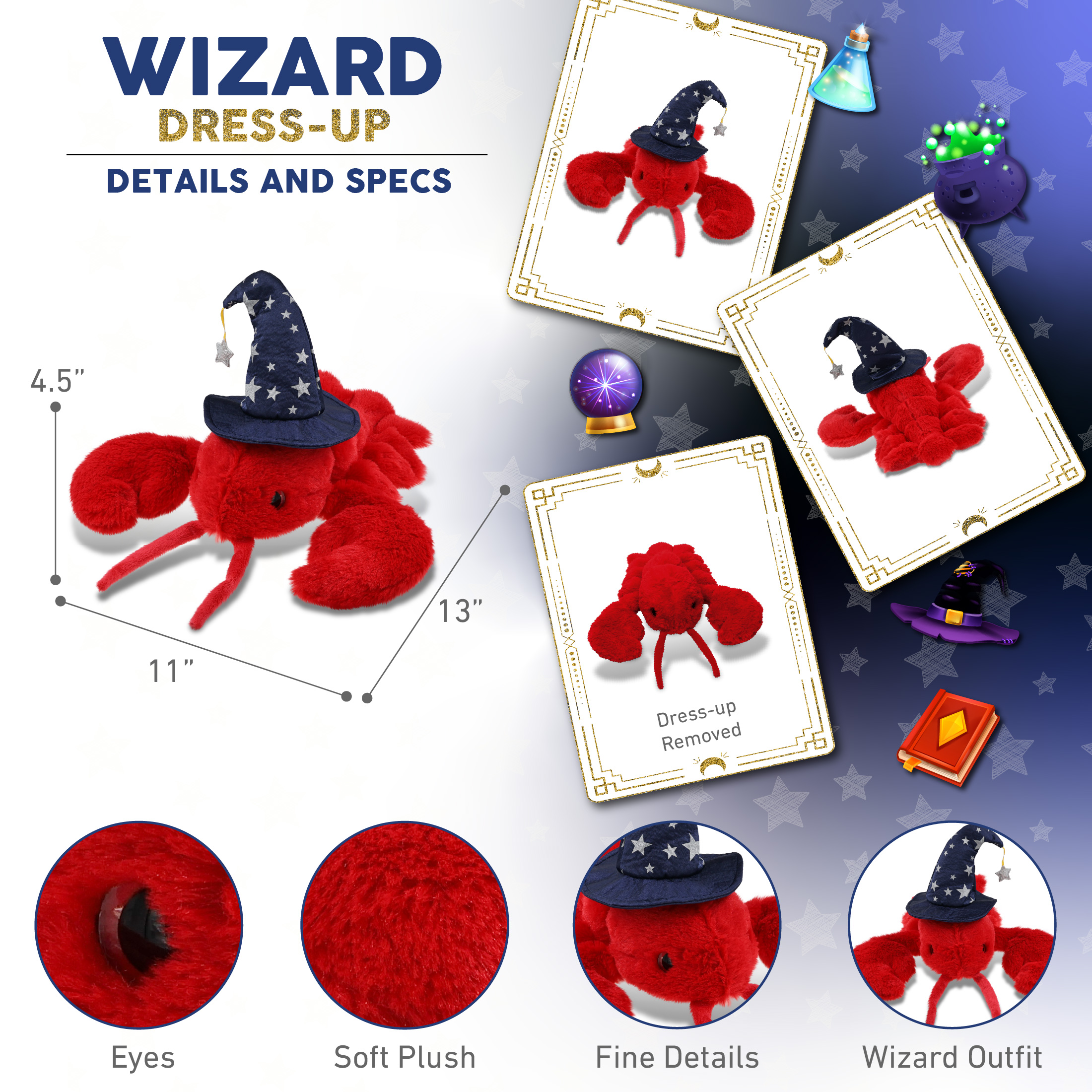 - Includes 1 DolliBu Elegant Red Lobster Toy with Wizard Stuffed Doll Clothes – This plush lobster ocean animal arrives in a magical wizard hat. Dressed in a blue wizard hat, this soft plush animal stands out in any wizard toy collection. It’s a great lobster gift for Halloween or birthdays. The wizard doll’s hat is securely stitched to the plush, ensuring safe and lasting playtime. This cute plush wizard buddy measures 13Lx11Wx4.5H inches.