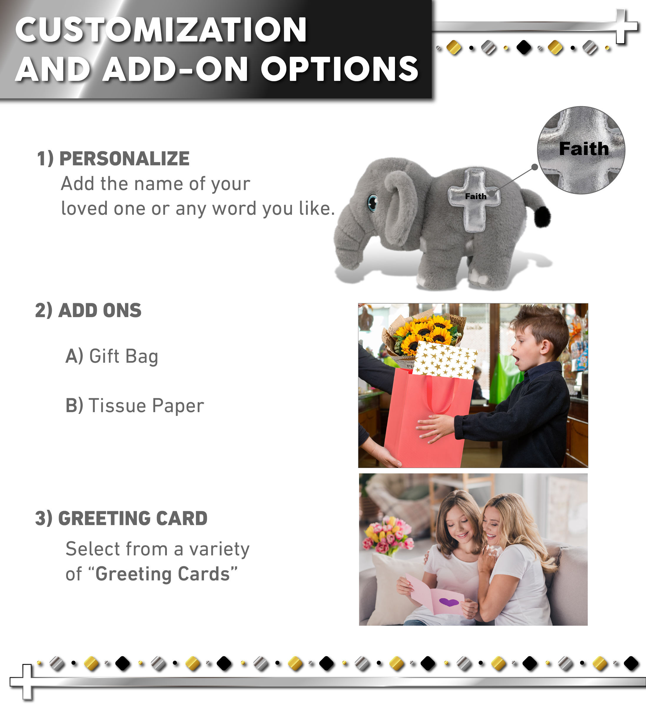 • Personalization, Customization, and Add-On Options – Super Soft Eco-Friendly Elephant stuffed animal bear comes customized with a shiny metallic cross. You can turn it into a personalized teddy bear with the name of a loved one, or add any word which we will imprint on the item. And last, you have the option to add some or all of the cool add-ons to make your gift extra special: 1) Gift Bag 2) Tissue Paper 3) Greeting Card.