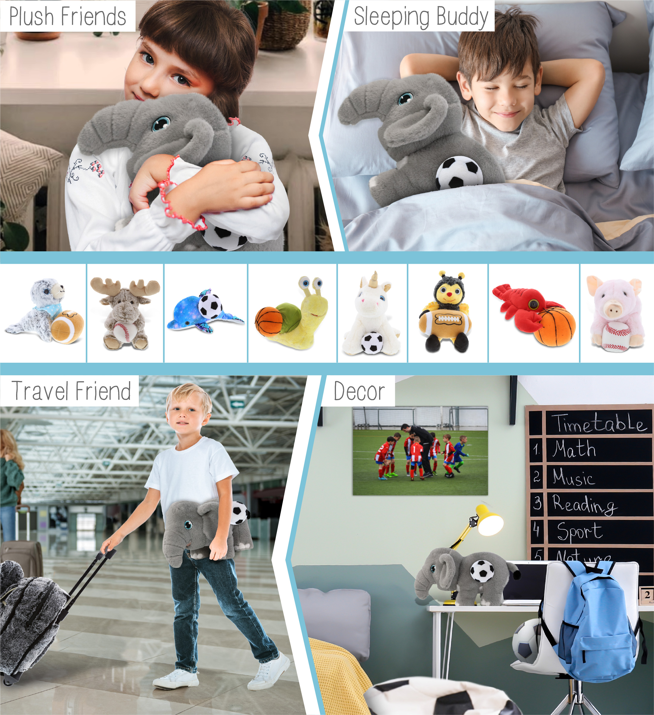 - Included with the Purchase of the Cute Elephant Plush – Includes 1 DolliBu Elephant Eco-Friendly Plush with a soccer ball plush, decorated with realistic features. The elephant’s body with a sports gift ball plush makes the plush perfect for cuddles. The elephant plush toy features details like its big ears and long trunk. The elephant’s eyes make the critter so charming. The cute elephant plush toy buddy measures 14Lx8Wx9H inches.