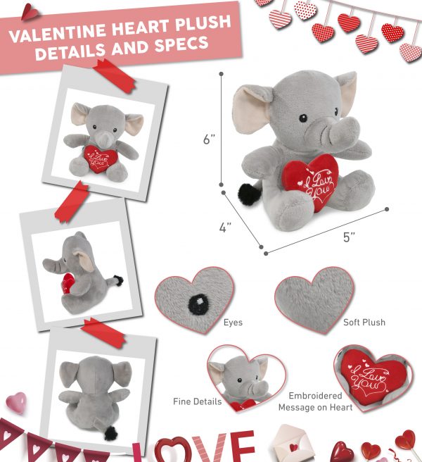- INCLUDED WITH THE PURCHASE OF VALENTINE PLUSH – Includes 1 DolliBu Super Soft Super Soft Elephant Valentines Day Stuffed Animal Plush with a romantic message embroidered on the red stuffed heart plush. Make this Valentine’s Day plush a sweet stuffed animal Valentine gift for boyfriend or girlfriend. husband, wife, or a cute elephant plush surprise for your kids who love playing with stuffed elephant. The stuffed plush measures 5Lx4Wx6H inches.