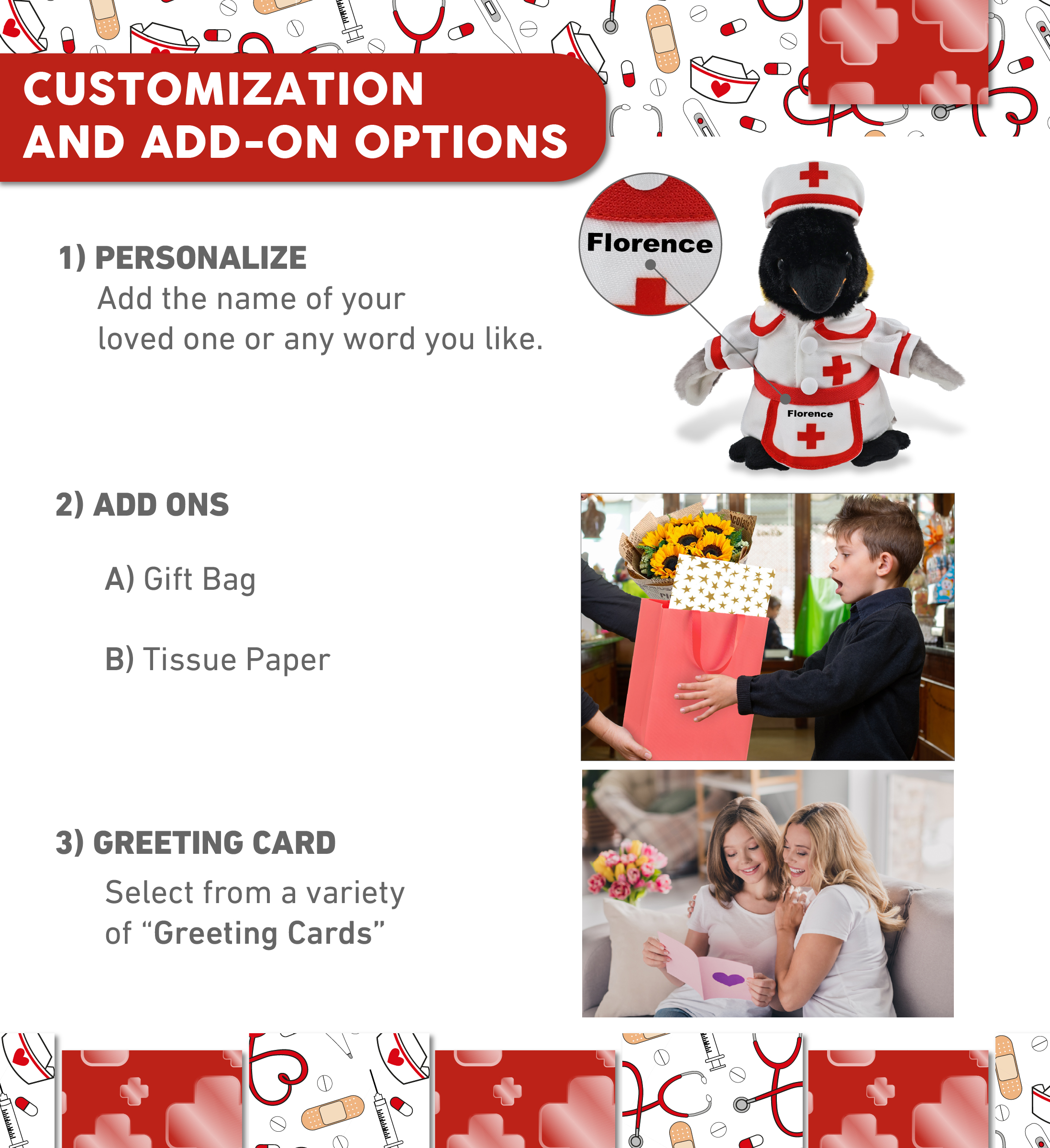 - Personalization, Customization, and Add-On Options – The stuffed penguin comes dressed in a cute nurse costume, complete with nurse cap, nurse dress and apron. Make your nurse penguin stuffed animal plush special by adding a personalized name, which we’ll imprint onto the plush. You can also customize your nurse penguin plush by adding any of our add-ons to create the perfect gift: 1) Gift Bag 2) Tissue Paper 3) Greeting Card.