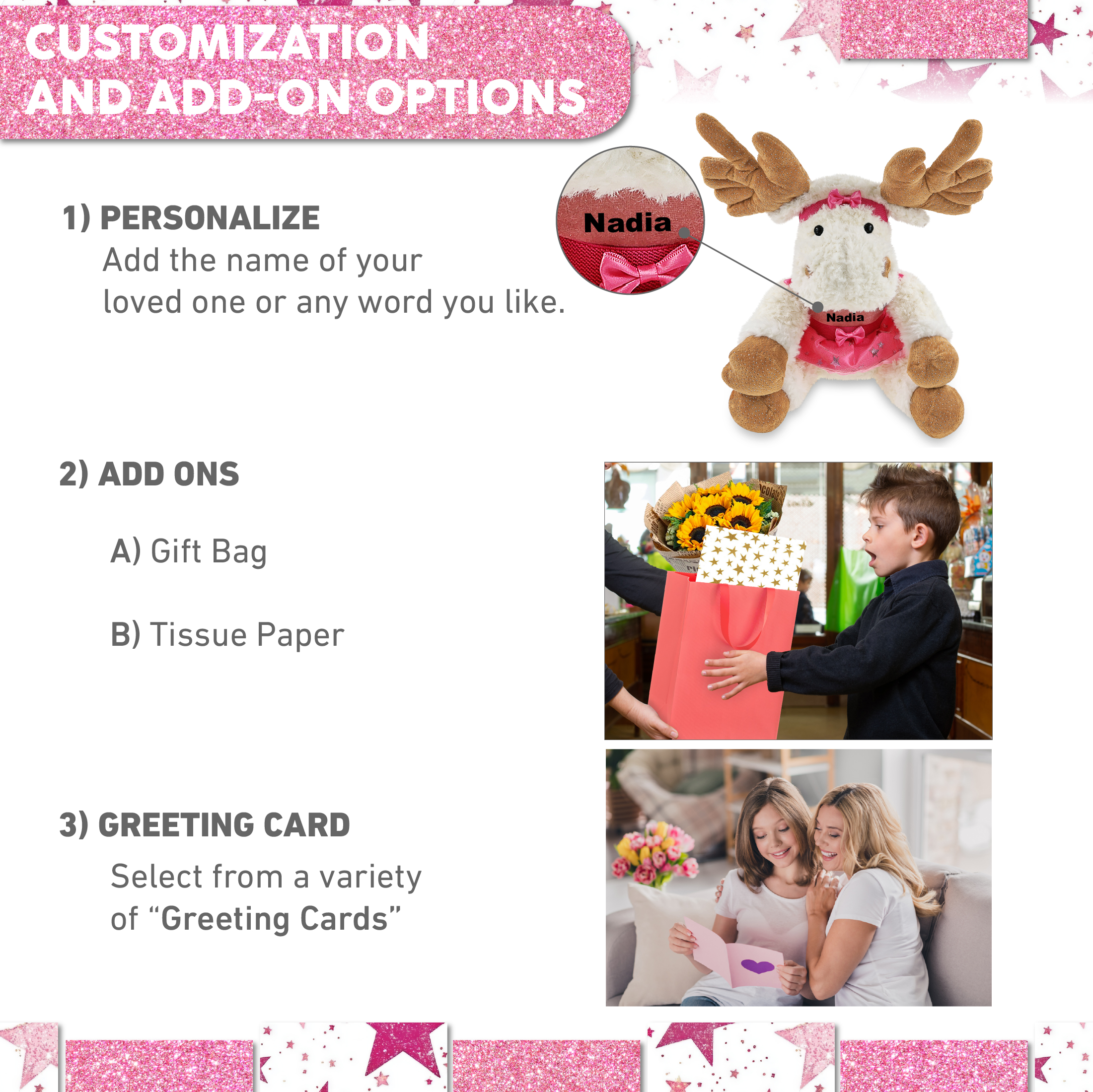- Personalization, Customization, and Add-On Options – The floppy moose plush toy comes dressed in a charming pink ballerina outfit, complete with tutu skirt, headband, and shirt. Make it meaningful by personalizing it with the name, which we will imprint directly onto the plush. You can also customize your ballerina moose stuffed animal doll by adding any of our add-ons to create the perfect gift: 1) Gift Bag 2) Tissue Paper 3) Greeting Card.