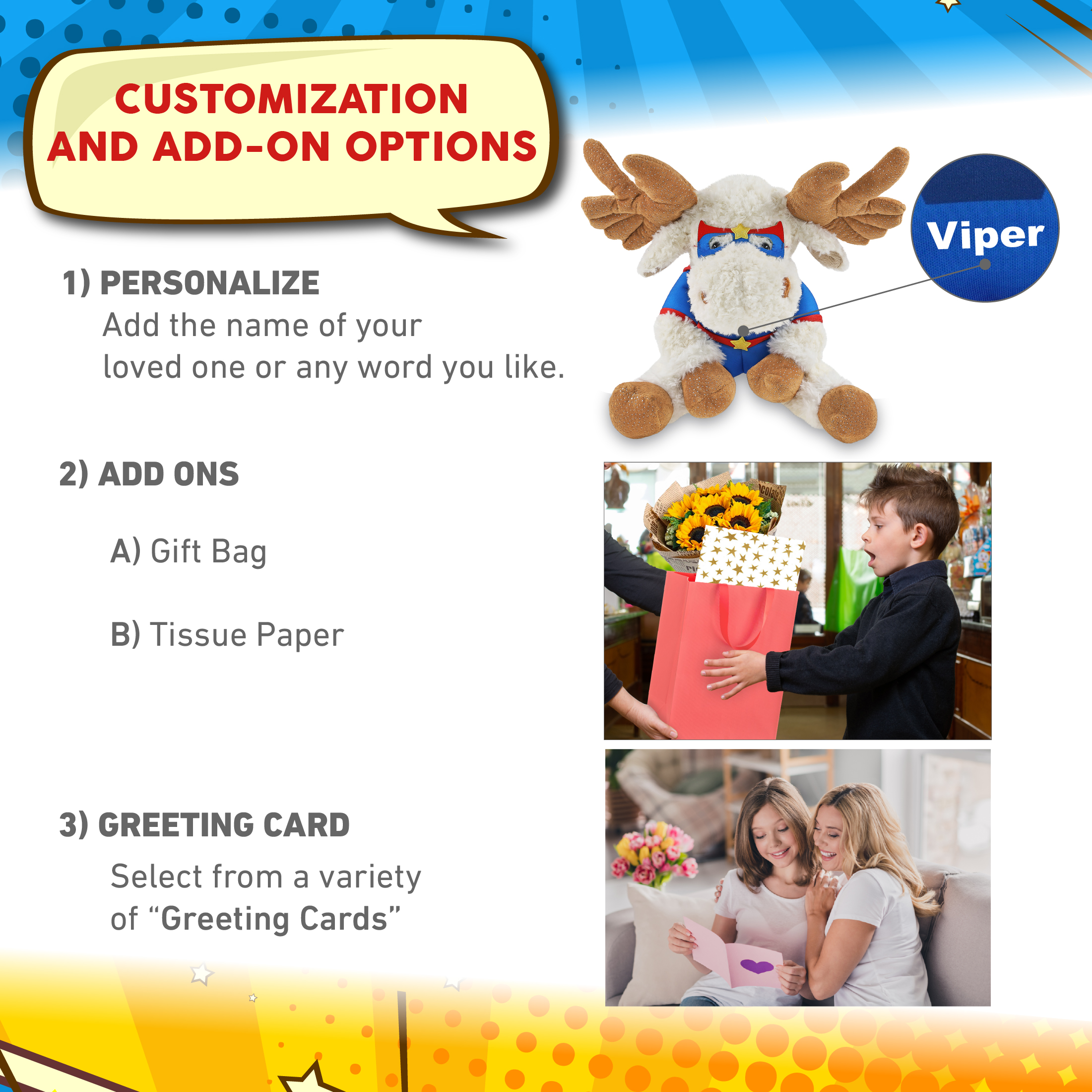 - Personalization, Customization, and Add-On Options – The fancy floppy moose stuffed animal comes dressed in a full superhero outfit, complete with eye mask, suit with cape, and star details. Make your super hero moose toy special by adding a personalized name, which we will imprint onto the plush. You can also customize your plush hero toy by adding any of our add-ons to create the perfect gift: 1) Gift Bag 2) Tissue Paper 3) Greeting Card.