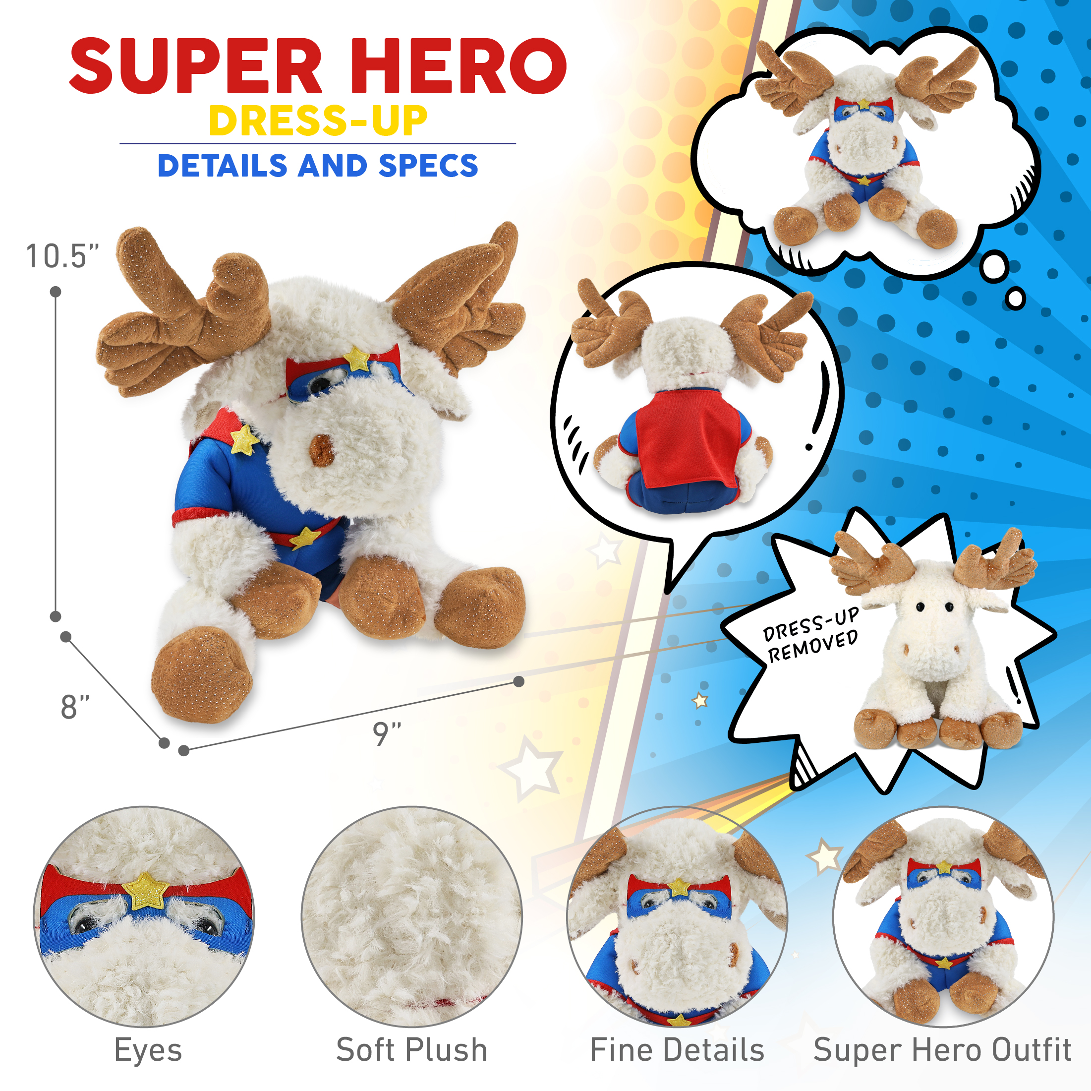 - Features a Cute Teddy Bear Moose Plush with Superhero Cape Outfit – With a mask, suit, and cape, this moose plush toy comes with a playful and stylish look that results in two fun themes: wildlife and superheroes! Great teddy bear stuffed animal for adventure plush storytelling, animal toy kid playtime, or as a classroom buddy. A unique addition to any stuffed superhero lineup or plush animal kid collection with dressed stuffed animals.