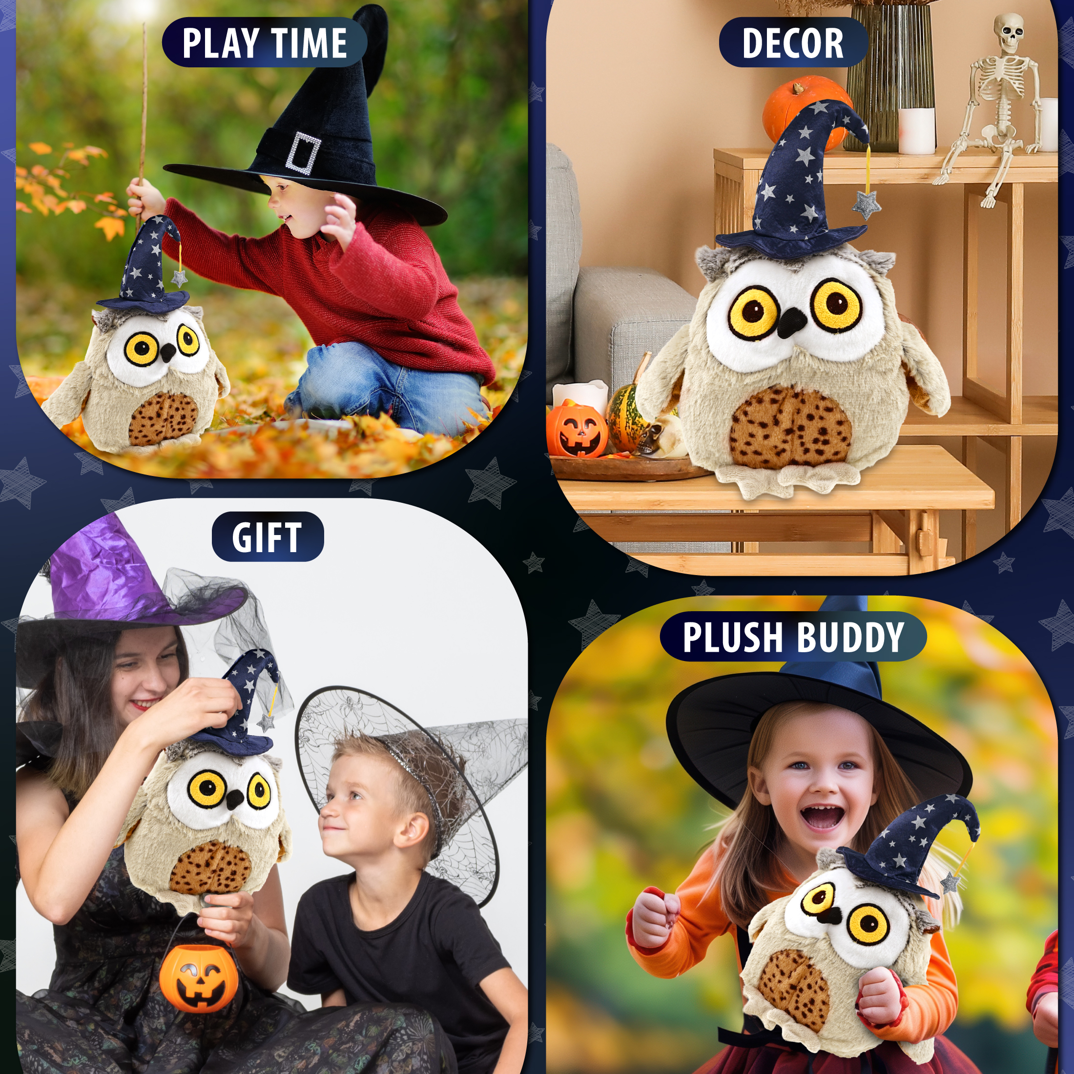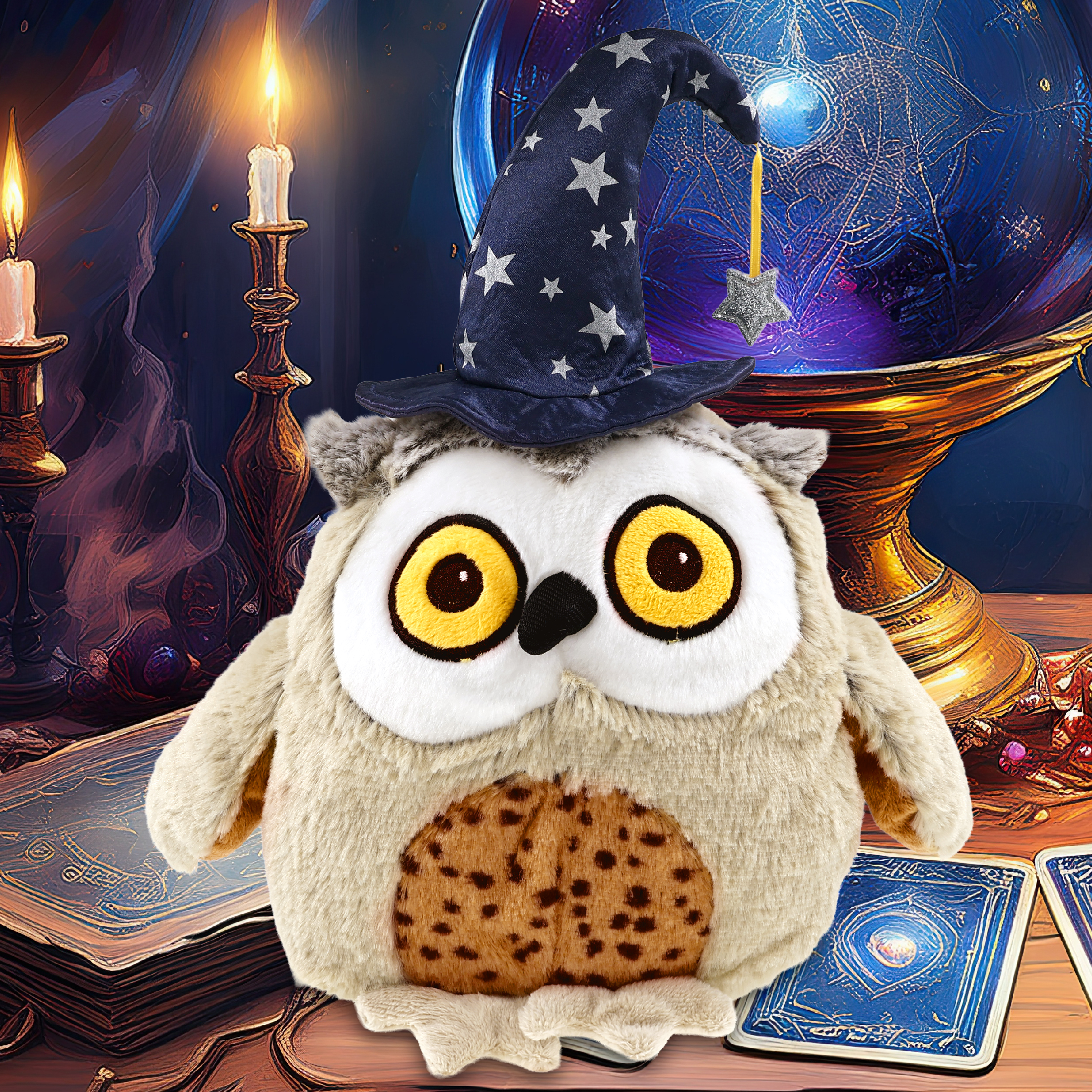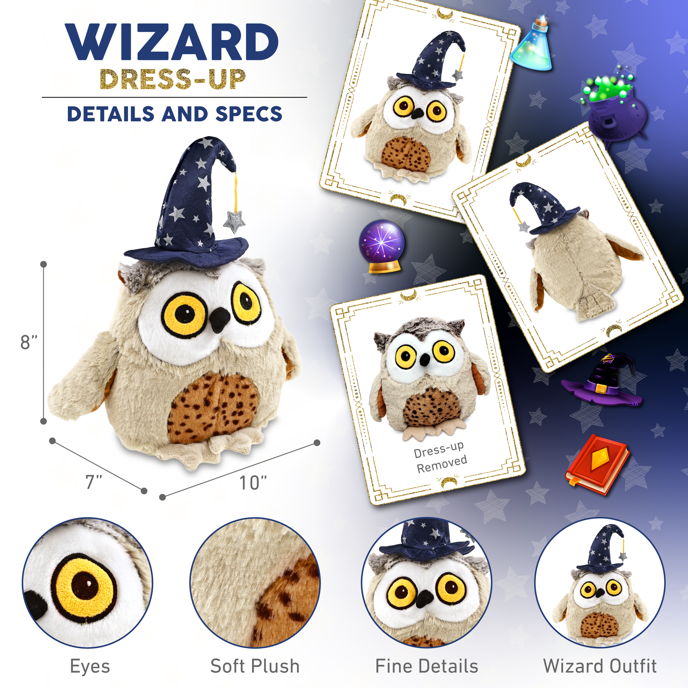 - Features a Fat Brown Owl Plush with Wizard Stuffed Animal Hat – With a wizard stuffed animal hat adorned with silver stars, this brown owl Halloween stuffed animal has a playful and stylish magical look! The detailed wizard fantasy hat adds character to your stuffed toys and makes them stand out among other cute brown owl figures. Everyone will love to play with a huggable stuffed animal with wizard clothes for stuffed animals.