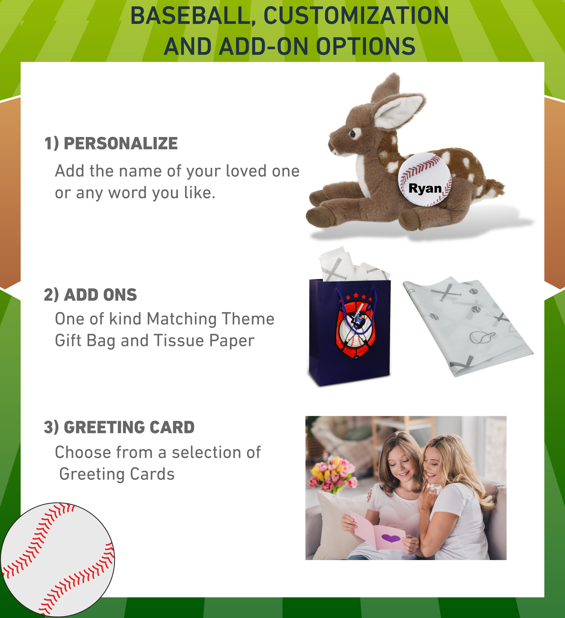 - Personalization, Customization, and Add-On Options – The Super Soft Sports Stuffed Animal Fawn Deer comes customized with a small baseball plush. You can personalize your stuffed animal deer with the name of your loved one which we will imprint on the item. You also have the option to add some or all of the cool add-ons to make your gift extra special: 1) Gift Bag; 2) Tissue Paper; 3) Greeting Card.