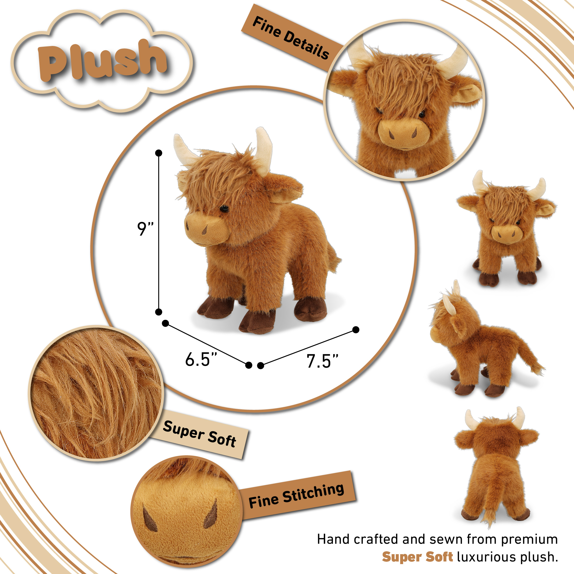 - This Floppy Brown Highland Cow Plush Measures Approximately 7.5Lx6.5Wx9H Inches – This plush cow is designed in a compact standing size that is easy to hold, hug, and display. The size makes it suitable for small hands while still providing a soft plush presence. The stuffed animal’s floppy structure allows for relaxed posing on beds, shelves, or play areas.