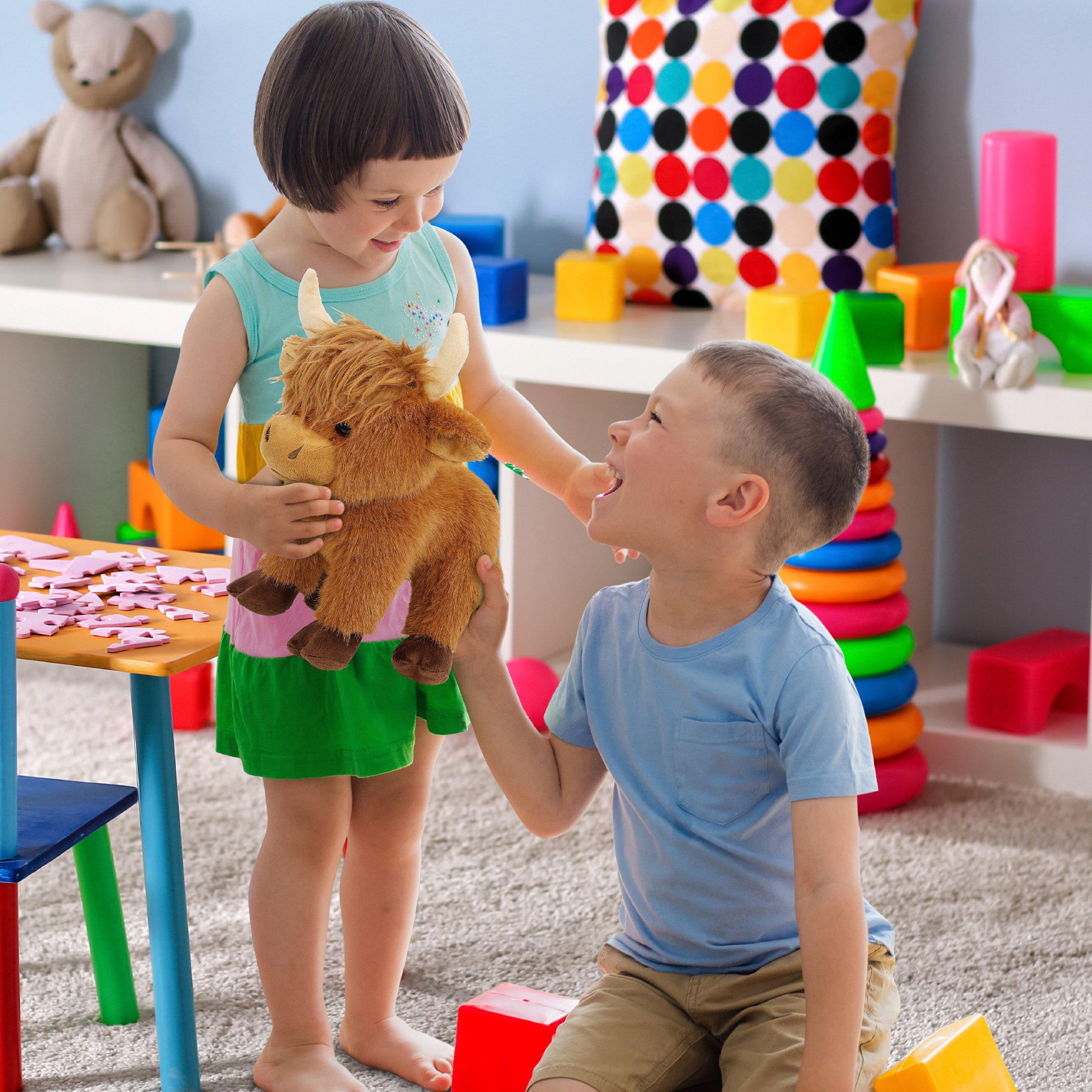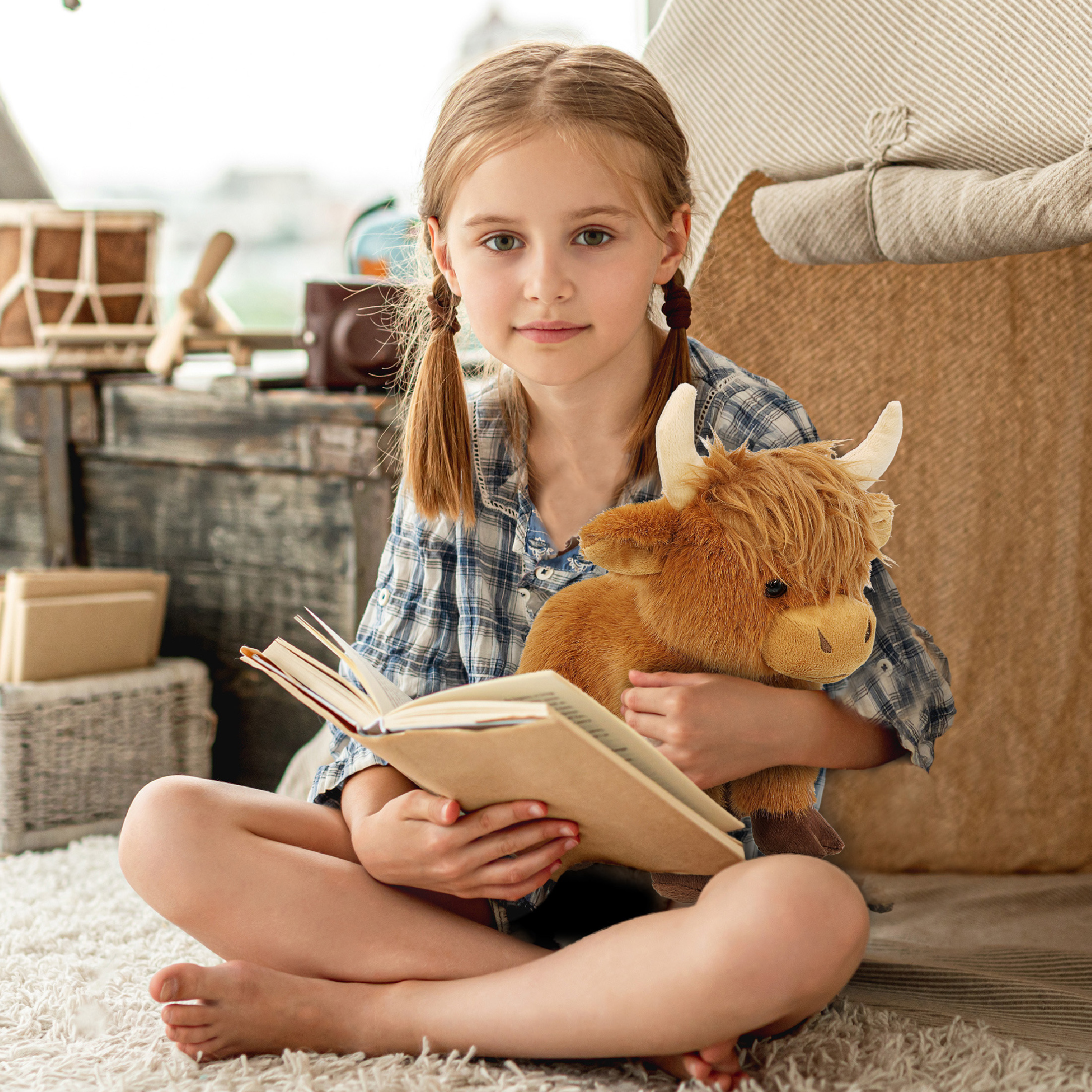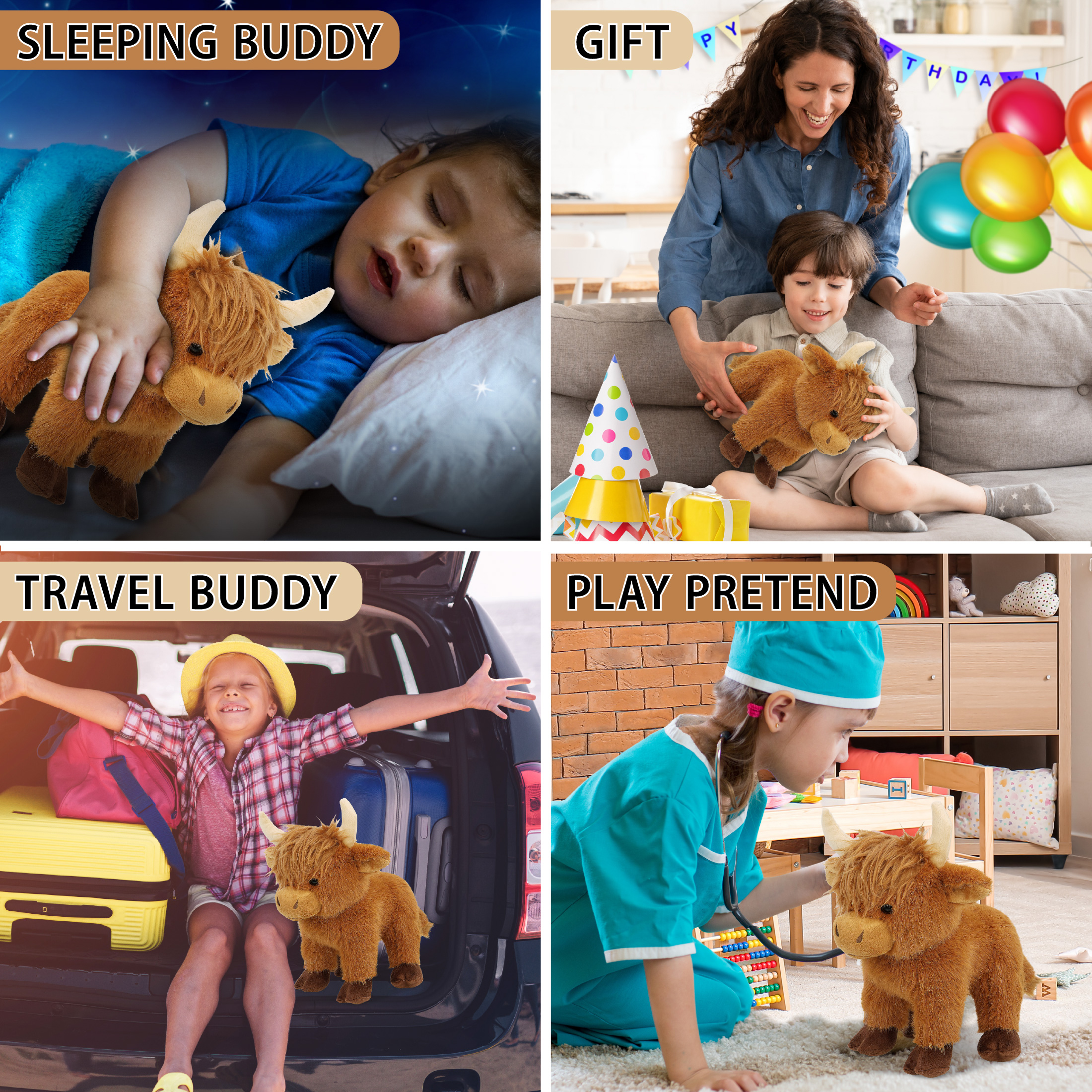 - Floppy Cow Plush for Playtime, Display, and Gifting – Suitable for kids and adults who enjoy farm-themed plush toys. The soft body makes it appropriate for playtime, while the detailed design allows it to be used as a decorative plush on shelves, beds, or desks, alongside other stuffed farm animals. This highland cow plush makes a suitable addition to collections of cow stuffed toys.