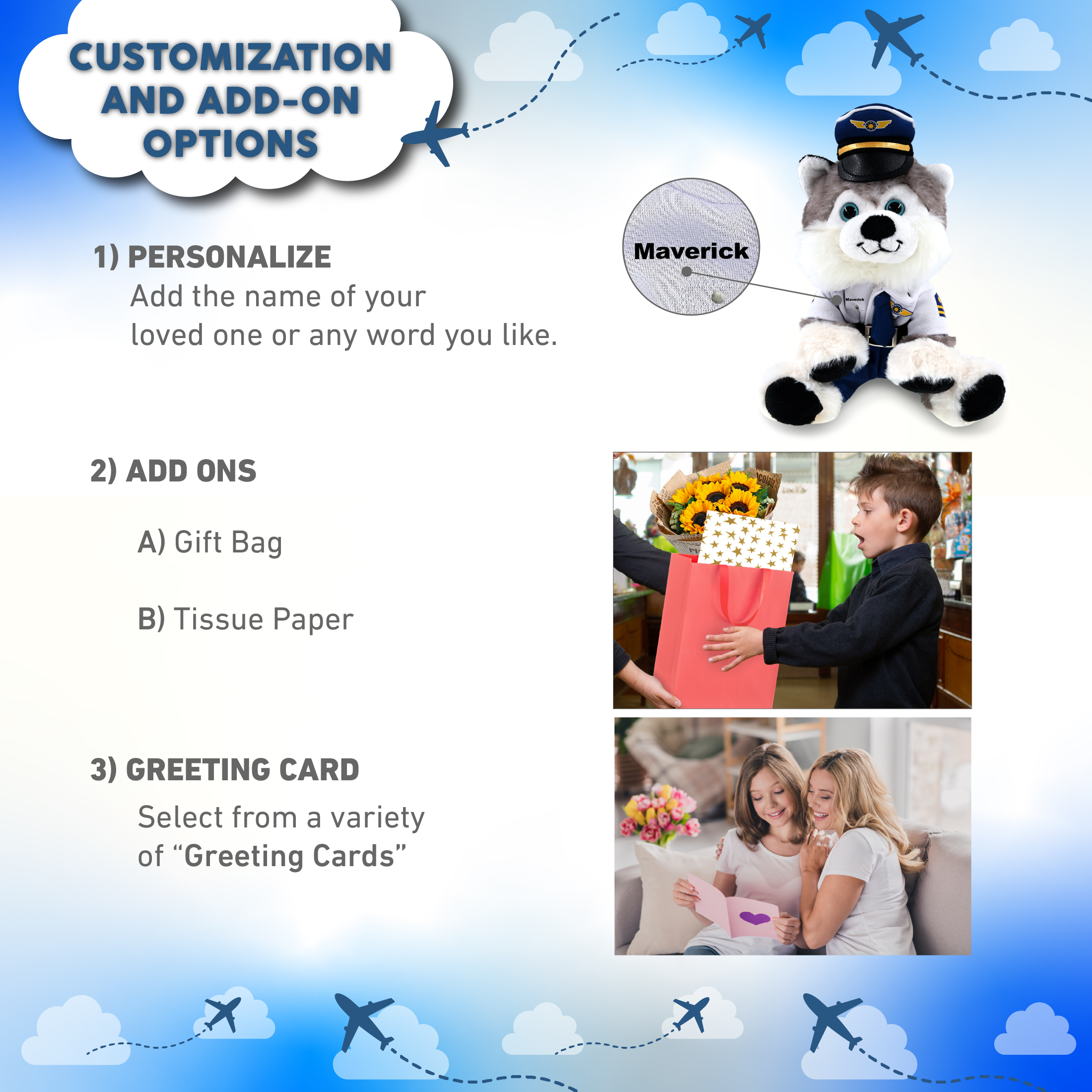 - Personalization, Customization, and Add-On Options – The husky stuffed animal comes dressed in a full pilot outfit set, with a white pilot shirt, captain hat, belt, and pants. Make your pilot stuffed bear special by adding a personalized name, which we will imprint onto the plush. You can customize your plush pilot toy by adding any of our add-ons to create the perfect gift: 1) Gift Bag 2) Tissue Paper 3) Greeting Card.