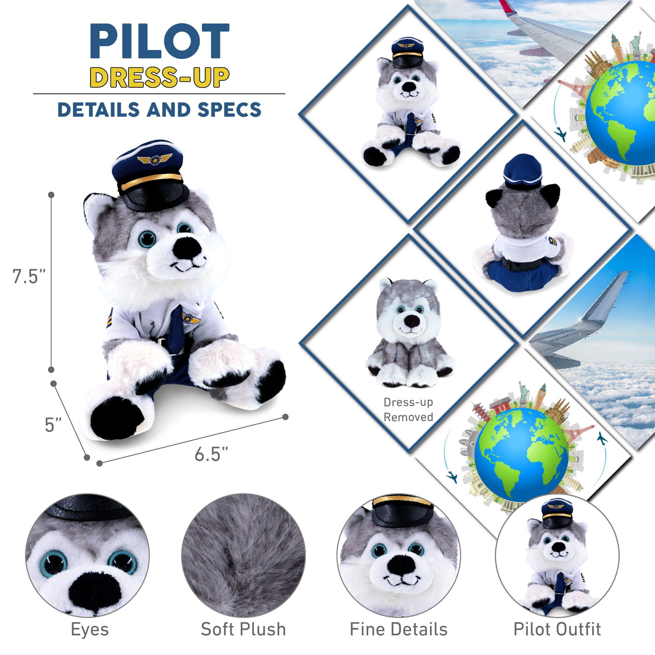 - Includes 1 DolliBu Floppy Husky Toy with Pilot Stuffed Animal Clothes – This Husky plush animal arrives in an airline pilot costume. Dressed in a white shirt, pants, belt, tie, and captain hat costume, perfect for dress up, travel themes, or playtime flight adventures. Great Halloween pilot costume for your plush toys or as aviation lover gifts. This cute husky wearing pilot clothes for stuffed animals measures 6.5Lx5Wx7.5H inches.
