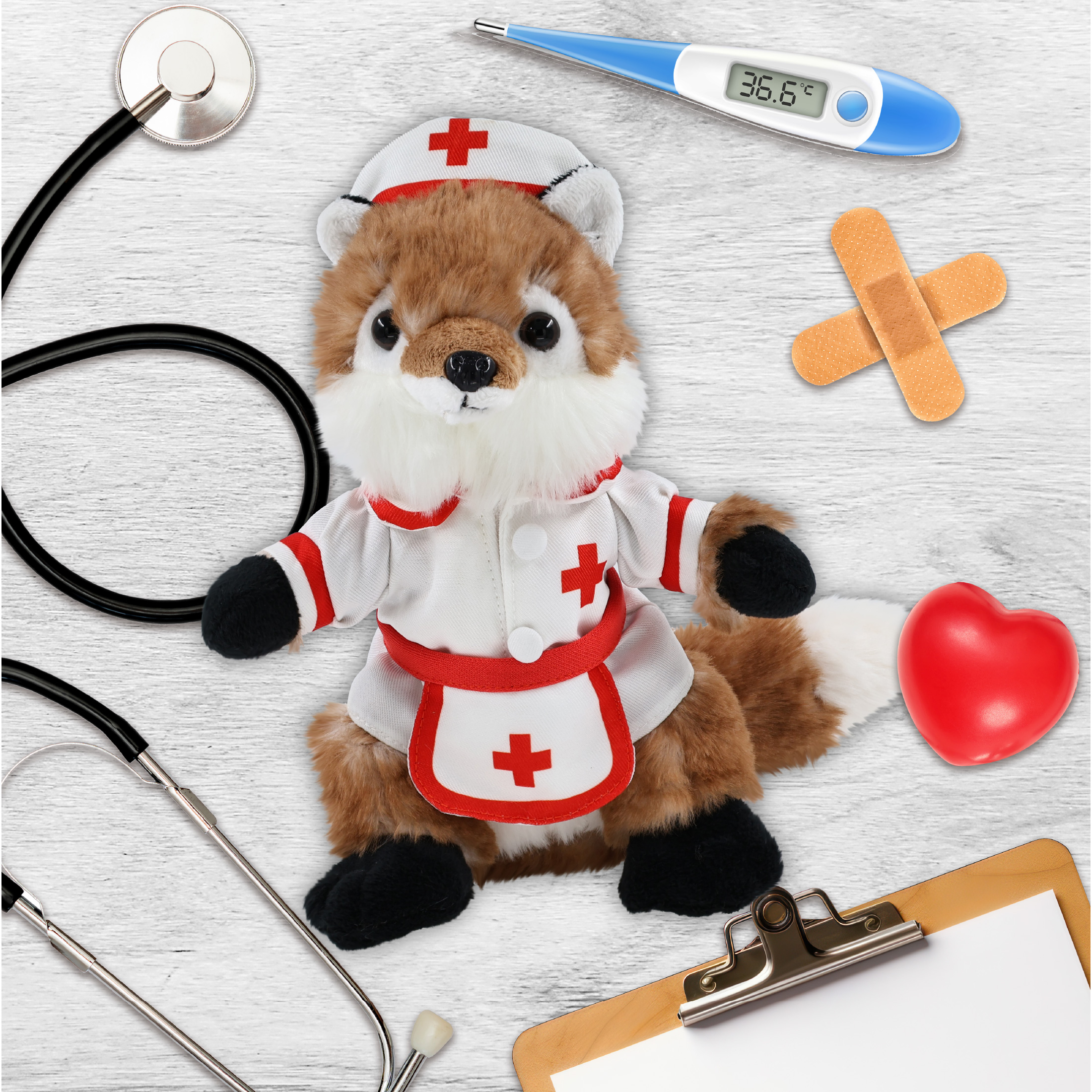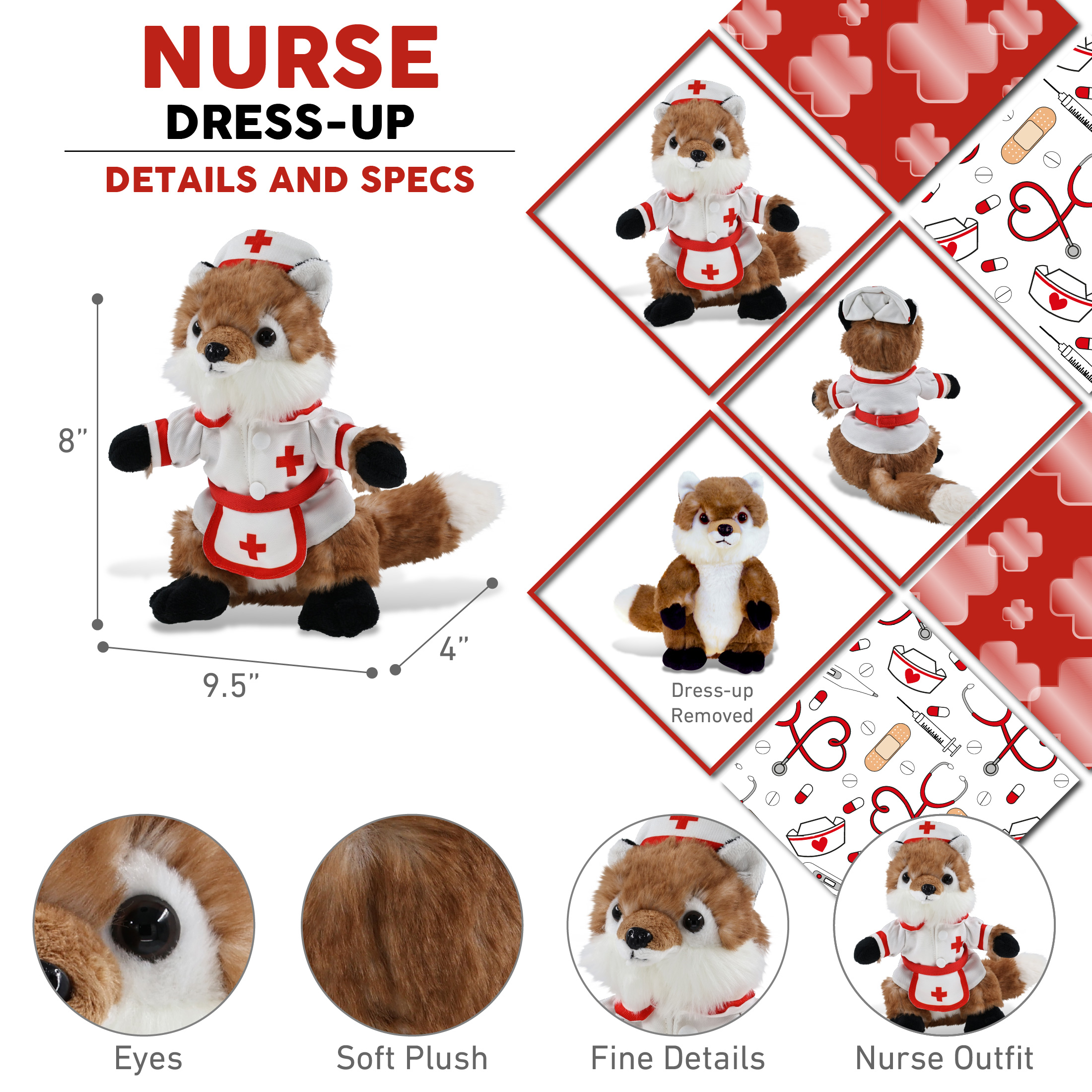 - Fox with Nurse Stuffed Animal Clothes Features a Classic Nurse Outfit – Designed with red lining and a cross against the white nurse dress and the nurse cap and apron. The fox stuffed animal plush has soft plush, perfect for everyday snuggles. This stuffed animal with clothes makes the perfect addition to your collection of fox teddy bear with clothes or giveaway hospital toys to give to sick children.