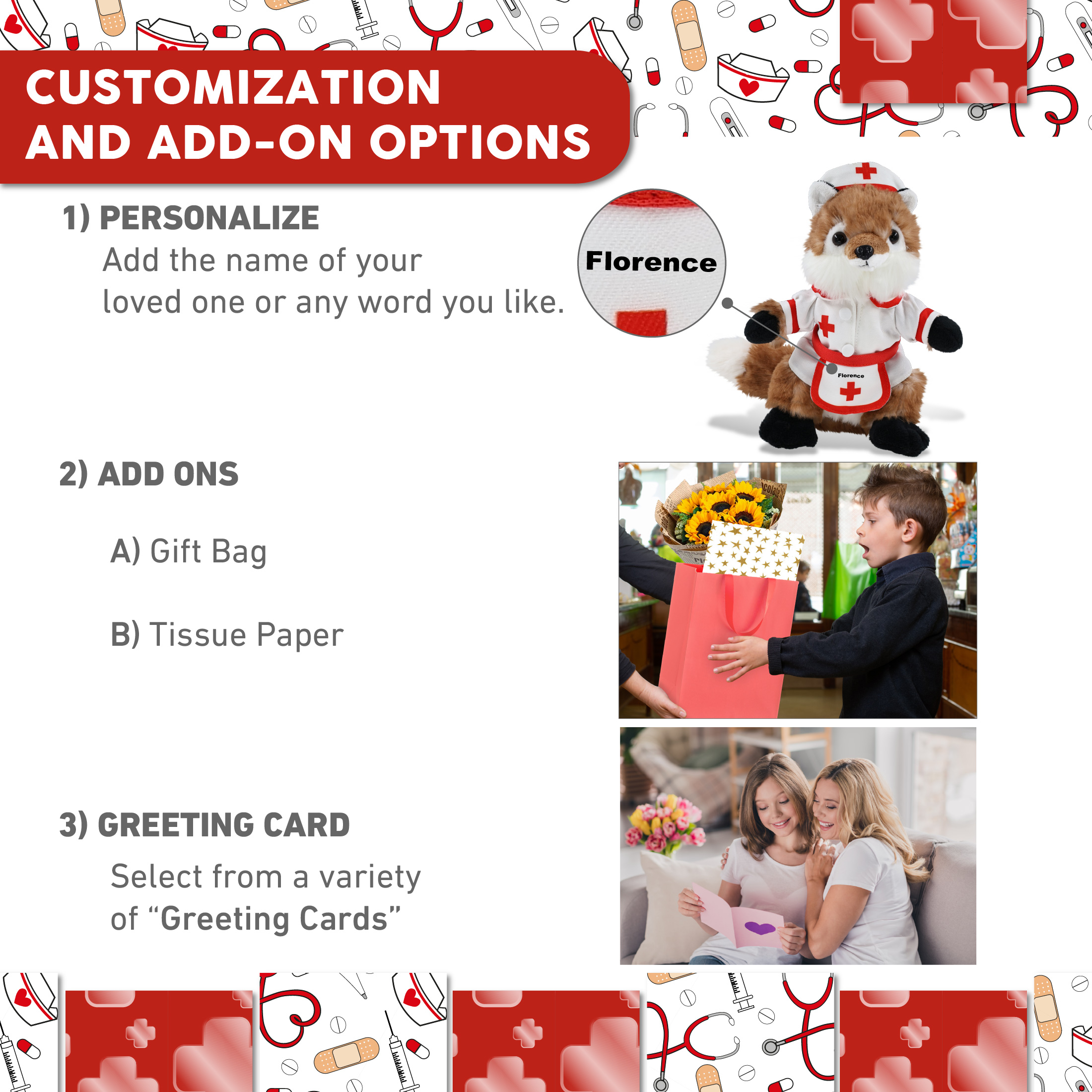 - Personalization, Customization, and Add-On Options – The stuffed Fox comes dressed in a cute nurse costume, complete with nurse cap, nurse dress and apron. Make your nurse teddy bear stuffed animal plush special by adding a personalized name, which we’ll imprint onto the plush. You can also customize your nurse fox plush by adding any of our add-ons to create the perfect gift: 1) Gift Bag 2) Tissue Paper 3) Greeting Card.