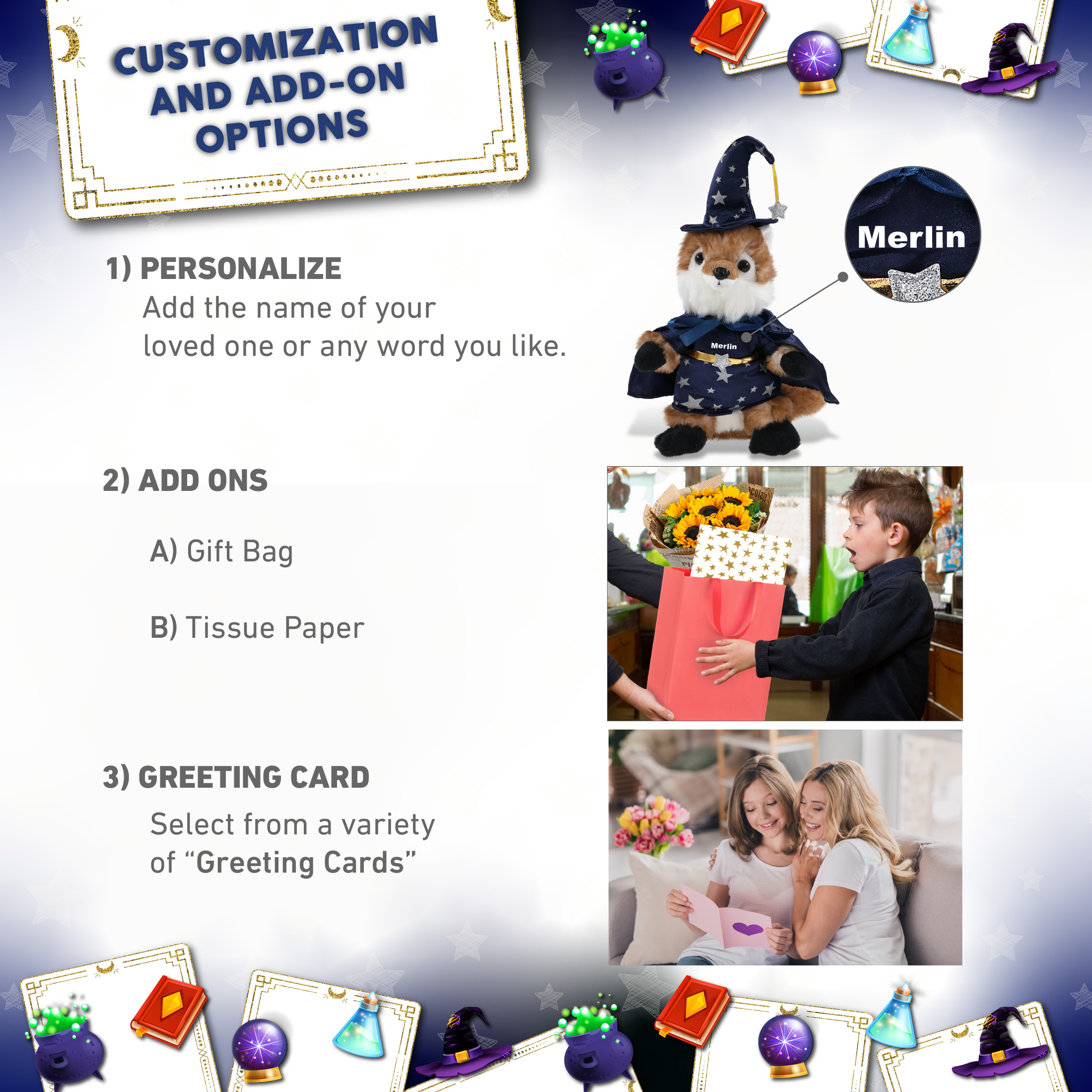 - Personalization, Customization, and Add-On Options – The fox stuffed animal comes dressed in a full wizard outfit, with a wizard cloak and hat with star details. Make your wizard stuffed fox special by adding a personalized name, which we will imprint onto the plush. You can customize your plush wizard toy by adding any of our add-ons to create the perfect gift: 1) Gift Bag 2) Tissue Paper 3) Greeting Card.