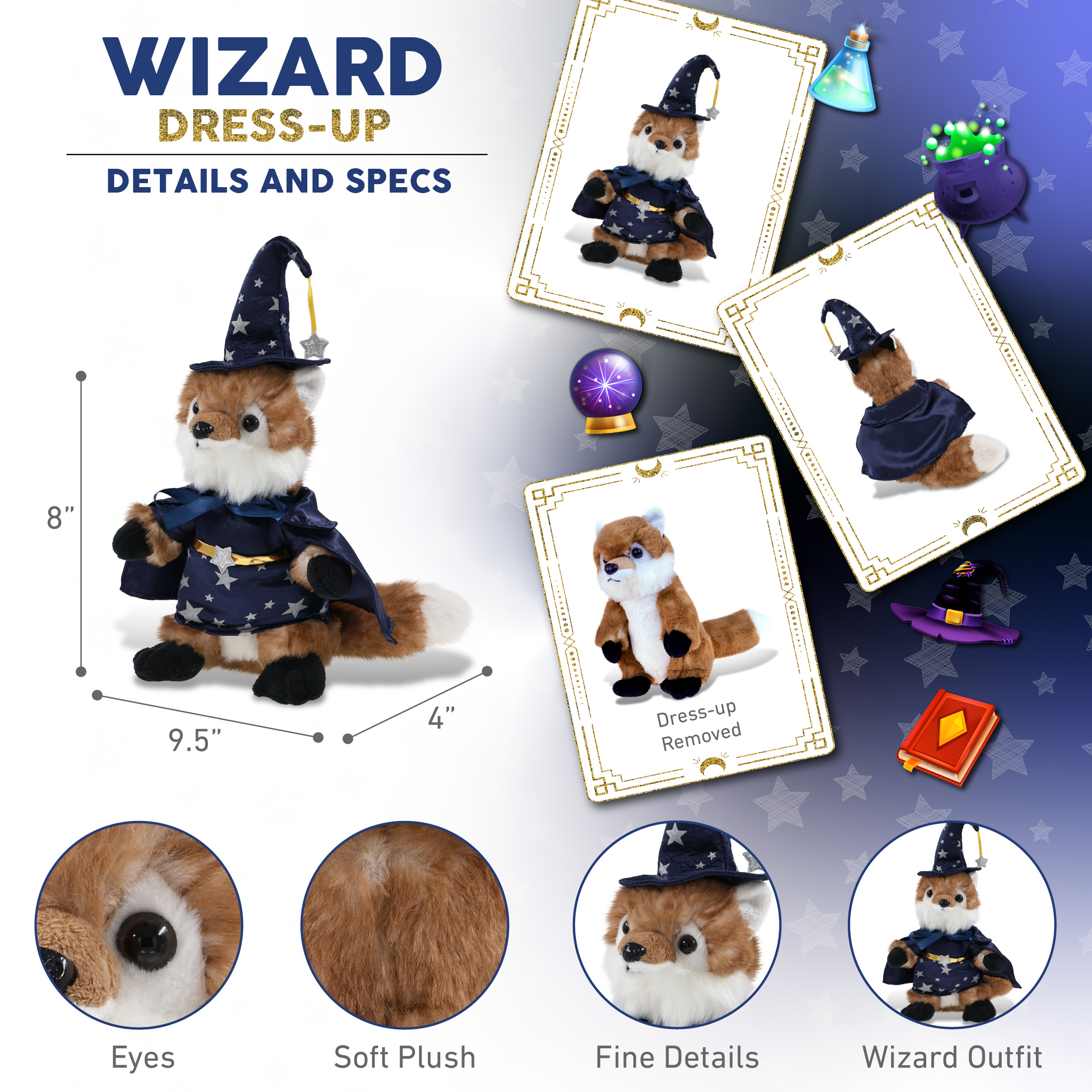 - Includes 1 DolliBu Fox Toy with Wizard Stuffed Animal Clothes – This plush animal arrives in magical wizard fox clothes. Dressed in a blue wizard robe and pointy hat, this fox stands out in any plush toy collection. It’s a great gift for Halloween, birthdays, or magical pretend play. The wizard doll clothes can be easily dressed or undressed for dress-up play. This cute fox plush wizard buddy measures 9.5Lx4Wx8H inches.