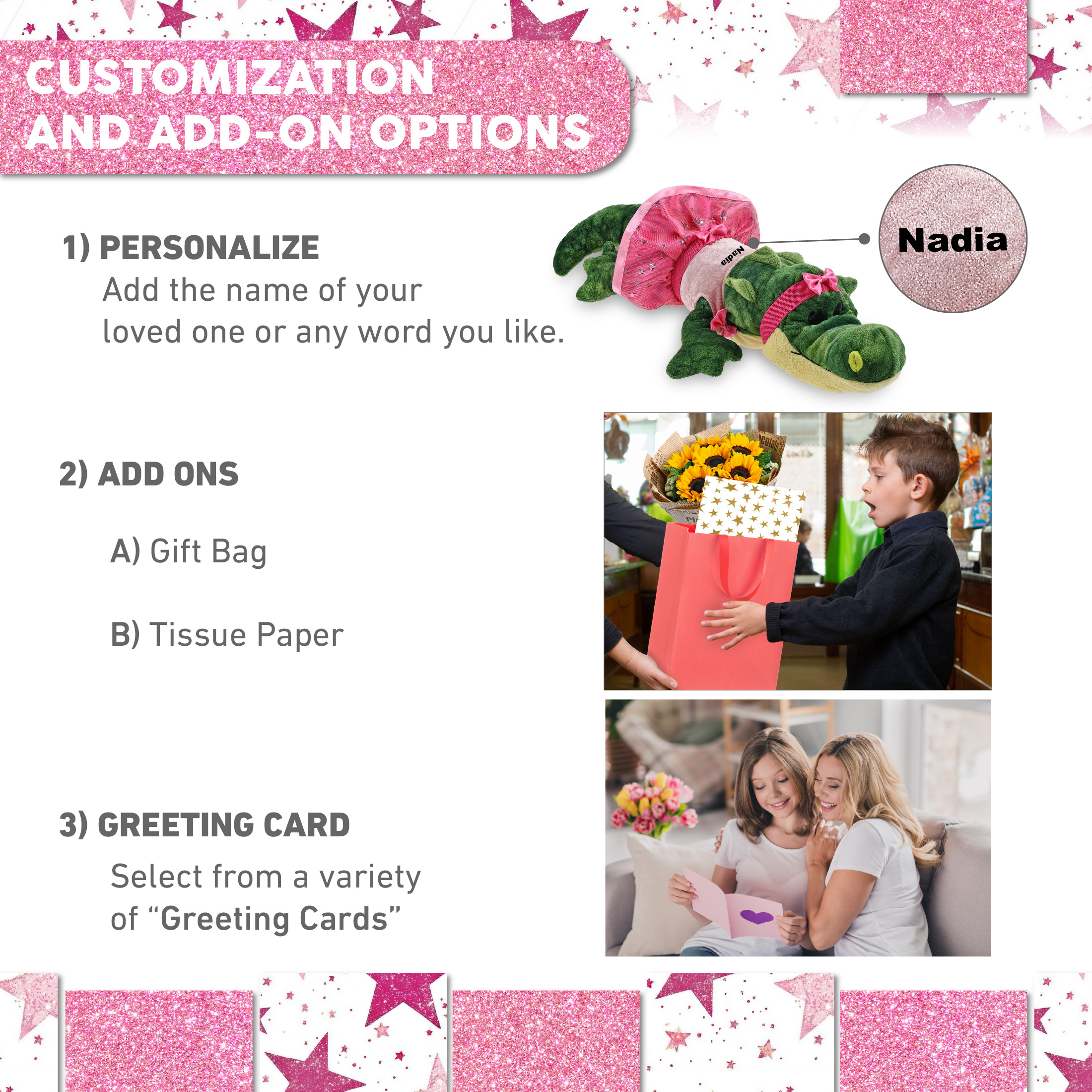 - Personalization, Customization, and Add-On Options – The alligator plush toy comes dressed in a charming pink ballerina outfit, complete with tutu skirt, headband, and shirt. Make it meaningful by personalizing it with the name, which we will imprint directly onto the plush. You can also customize your ballerina gator stuffed animal doll by adding any of our add-ons to create the perfect gift: 1) Gift Bag 2) Tissue Paper 3) Greeting Card.