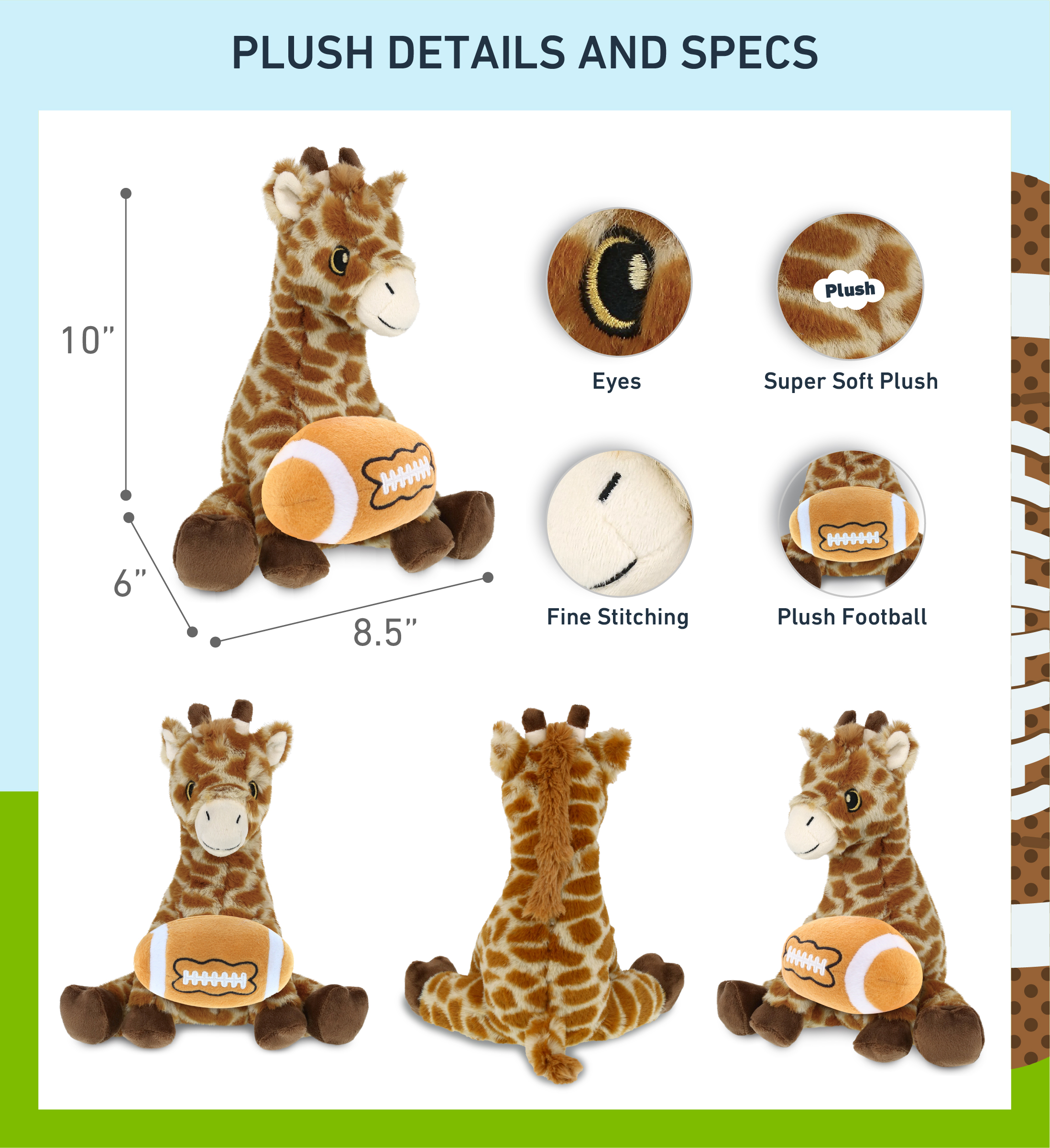 - Included with the Purchase of Adorable Cute Giraffe Plush – Includes 1 DolliBu Super Soft Eco-Friendly Giraffe with a football plush, decorated with realistic features of a cute giraffe. The body with a sports gift ball plush makes the plush perfect for cuddles. The giraffe plush toy features its iconic horns. The giraffe’s eyes make the critter so charming. The cute giraffe plush toy buddy measures 8.5Lx6Wx10H inches.