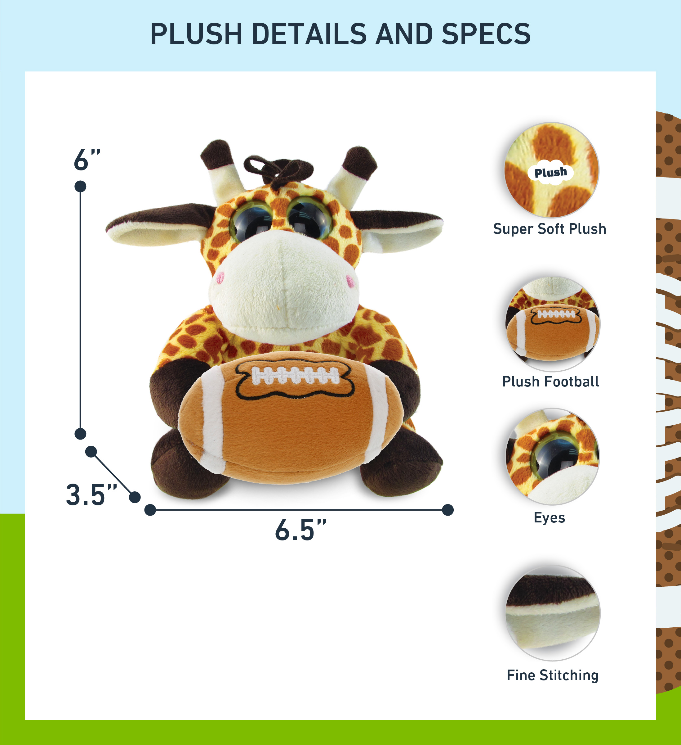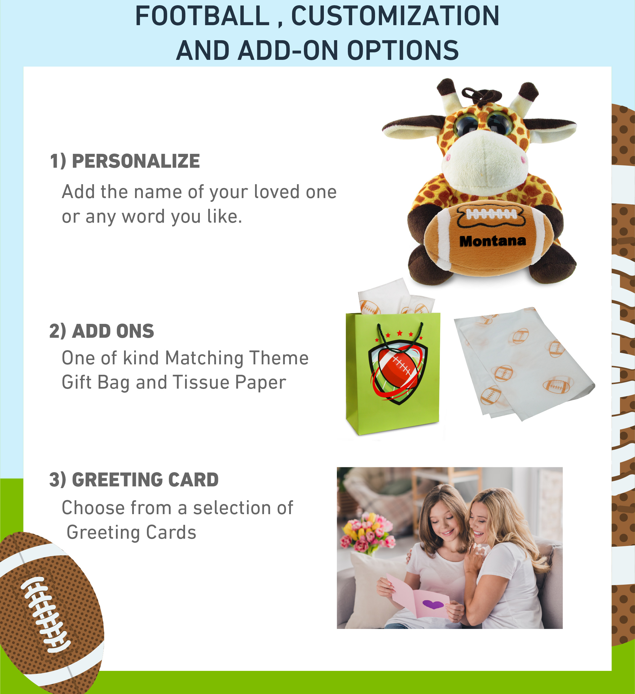 - PERSONALIZATION, CUSTOMIZATION, AND ADD-ON OPTIONS – The Super Soft Sports Stuffed Animal Big Eye Giraffe comes customized with a Football Plush. You can personalize your giraffe plush toy with the name of your loved one imprinted on the item. You also have the option to add some or all of the cool add-ons to make your gift extra special: 1) Gift Bag; 2) Tissue Paper; 3) Greeting Card.
