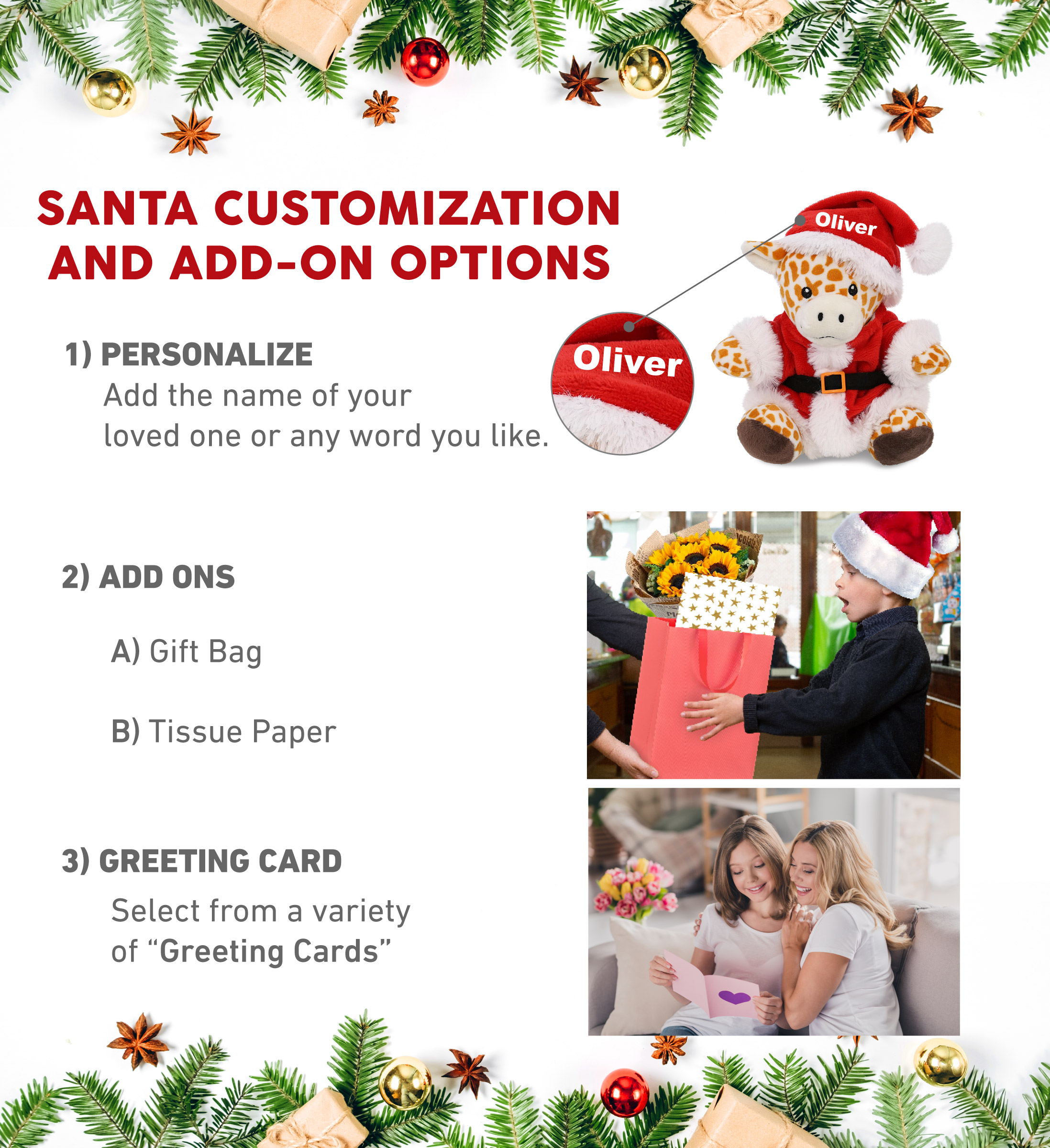 - Personalization, Customization, and Add-On Options – The Plush Giraffe comes with Santa Claus red outfit. You can personalize it with the name of your loved one which we will imprint on the item. You also have the option to add some or all of the cool add-ons to make it extra special: 1) Red, Pink or Blue Gift Bag; 2) Gold Hearts, Red Hearts or Gold Stars Tissue Paper; 3) Greeting Card – Merry Christmas, Get Well, Happy Birthday, I Love You.