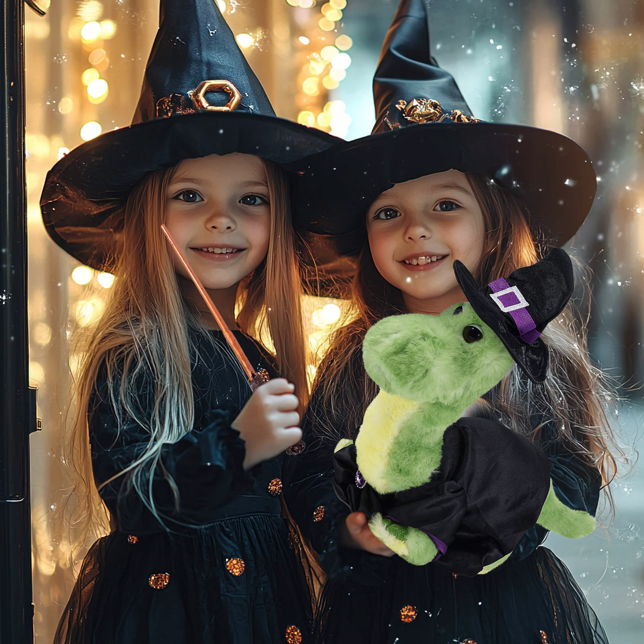 - Made of High-Quality Soft Polyester – The cute Halloween stuffed animal plush dinosaur with a witch black hat and cloak is made with super-soft, durable, premium-quality polyester materials. The spooky kids toys is designed for everyday hugs and creative dress-up fun, blending witch style with fun animal charm. The witch stuffed animal clothes include a hook and loop tape fastener on the back of the suit for quick and easy dressing.