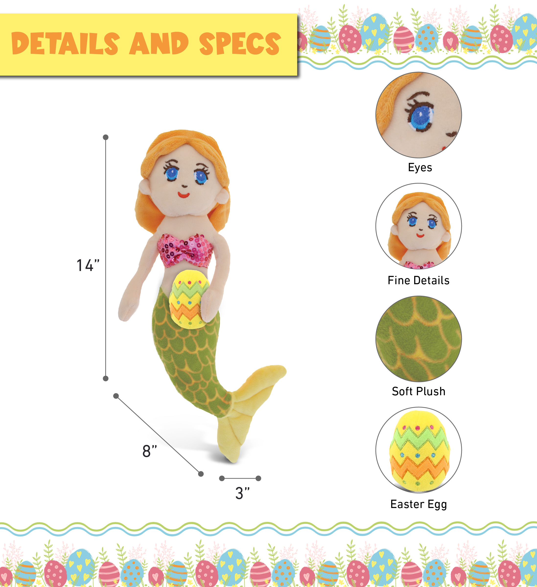 - HIGH-QUALITY EASTER PLUSH FOR GIRLS AND BOYS – Super Soft Plush Mermaid is a stuffed animal Easter plush made of premium 100% polyester. The mermaid is covered with colorful plush, the Easter egg is yellow with zig zags and dots in spring color. Cute stuffed animals for girls and boys crafted with durable materials designed to deliver a Welcome Spring and Easter message. To maintain the mermaid plush, wash with cold water and allow to air dry.
