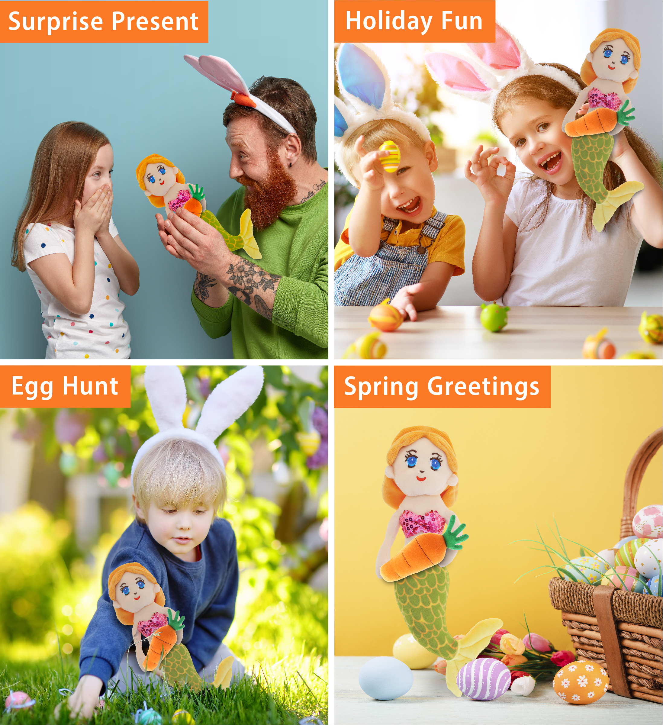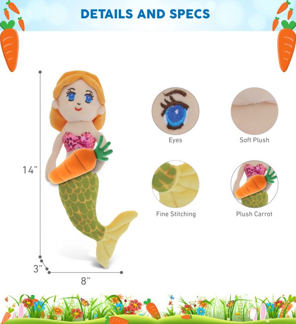 - THE PLUSH MERMAID STUFFED ANIMAL WITH A CARROT COMES WITH A UNIQUE DESIGN YOU WILL LOVE – Super Soft Easter Plush Green Mermaid comes with an orange Carrot Plush attached to the stuffed animal, making it a perfect plush gift to celebrate Easter. DolliBu’s Easter Mermaid Plush is a sweet present for anyone who loves and collects cute stuffed toys. A must-have animal plush gift to celebrate and make this year’s Easter a memorable occasion.