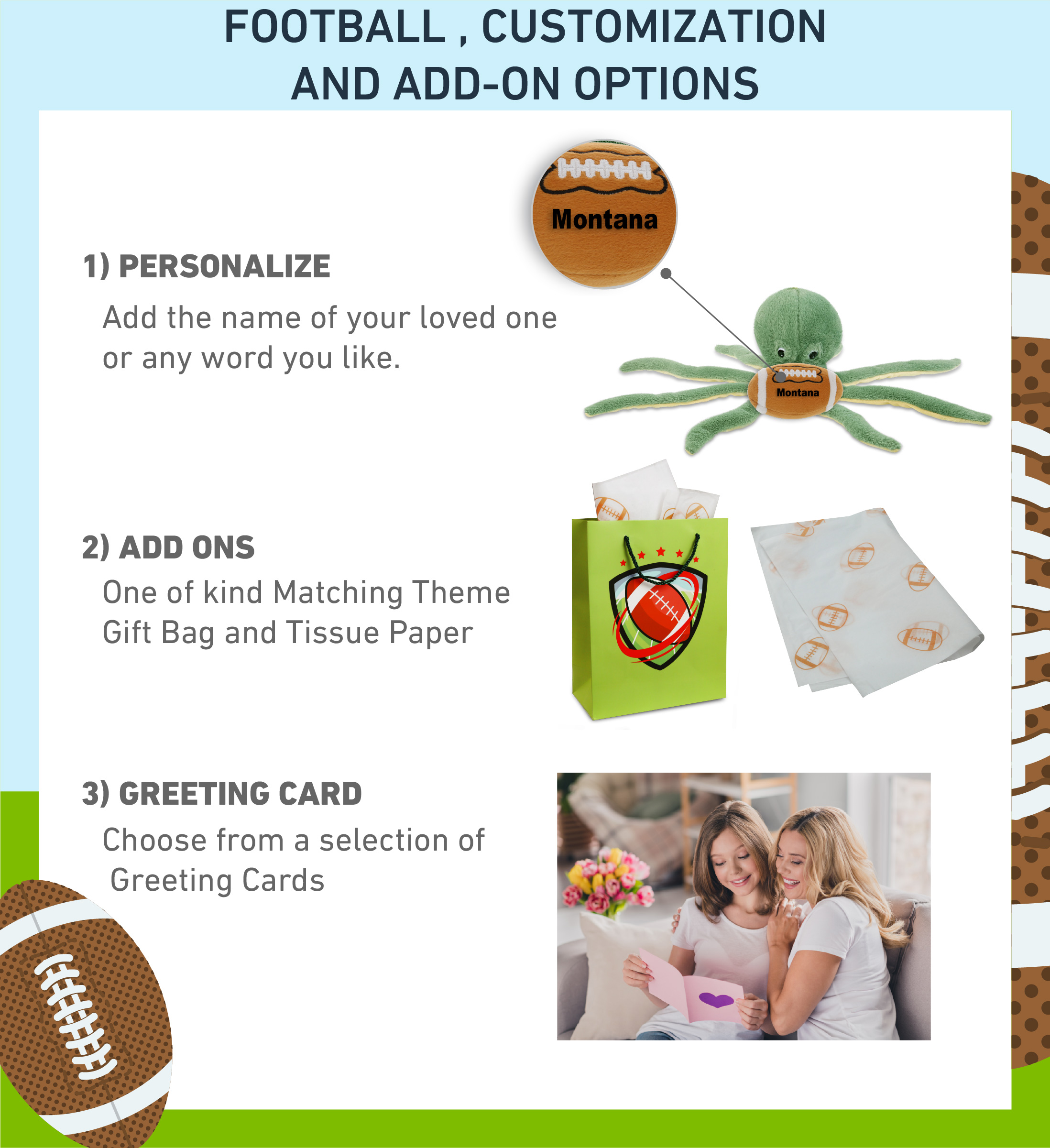 • Personalization, Customization, and Add-On Options – This Super Soft Sports Stuffed Animal Green Octopus Plush comes customized with a football plush. You can personalize it with the name of your loved one imprinted on the item. You also have the option to add some or all of the cool add-ons to make your gift extra special: 1) Gift Bag; 2) Tissue Paper; 3) Greeting Card.