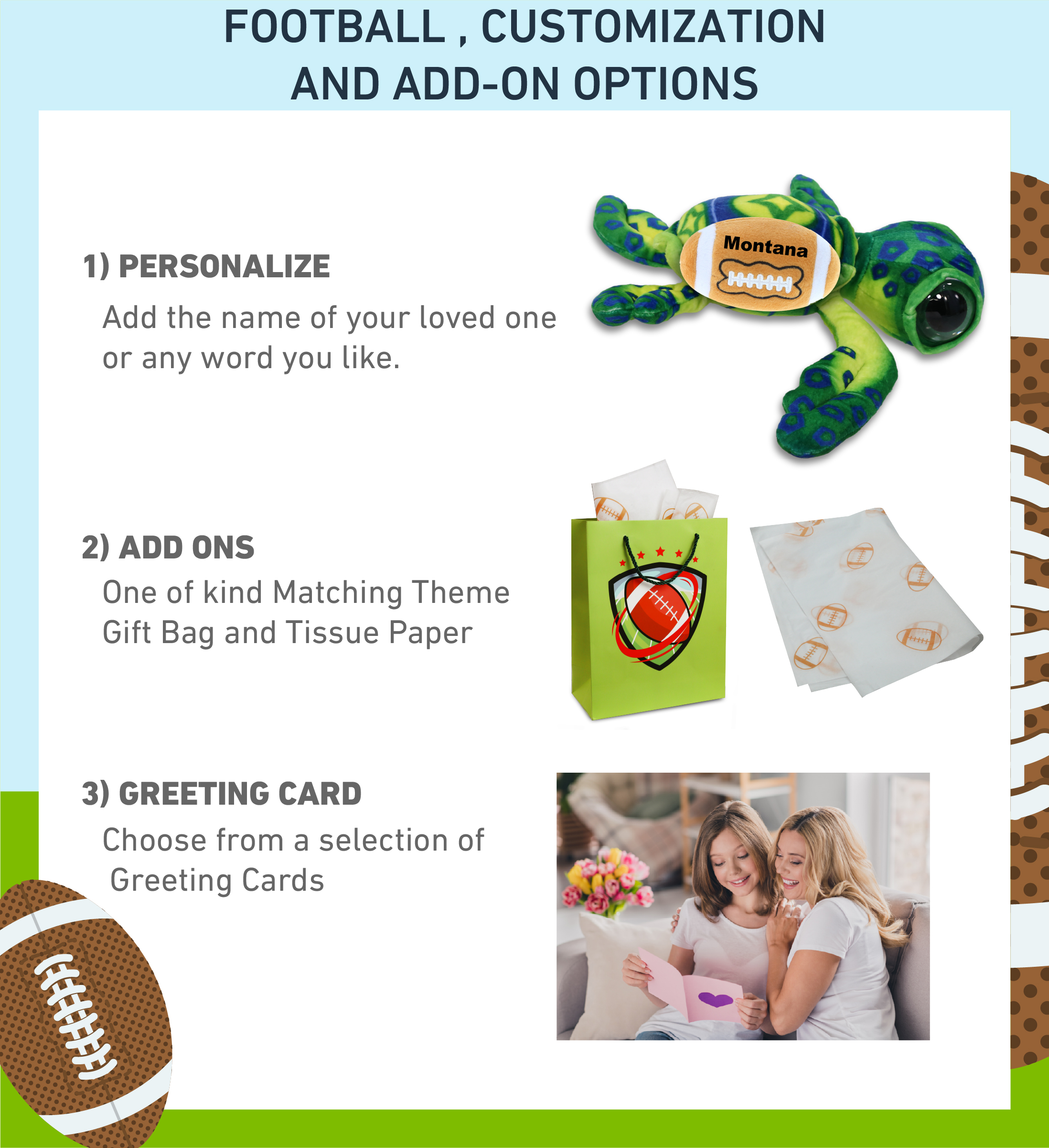 - Personalization, Customization, and Add-On Options – This Super Soft Sports Stuffed Animal Wild Collection Green Sea Turtle Plush comes customized with a football plush. You can personalize it with the name of your loved one imprinted on the item. You also have the option to add some or all of the cool add-ons to make your gift extra special: 1) Gift Bag; 2) Tissue Paper; 3) Greeting Card.
