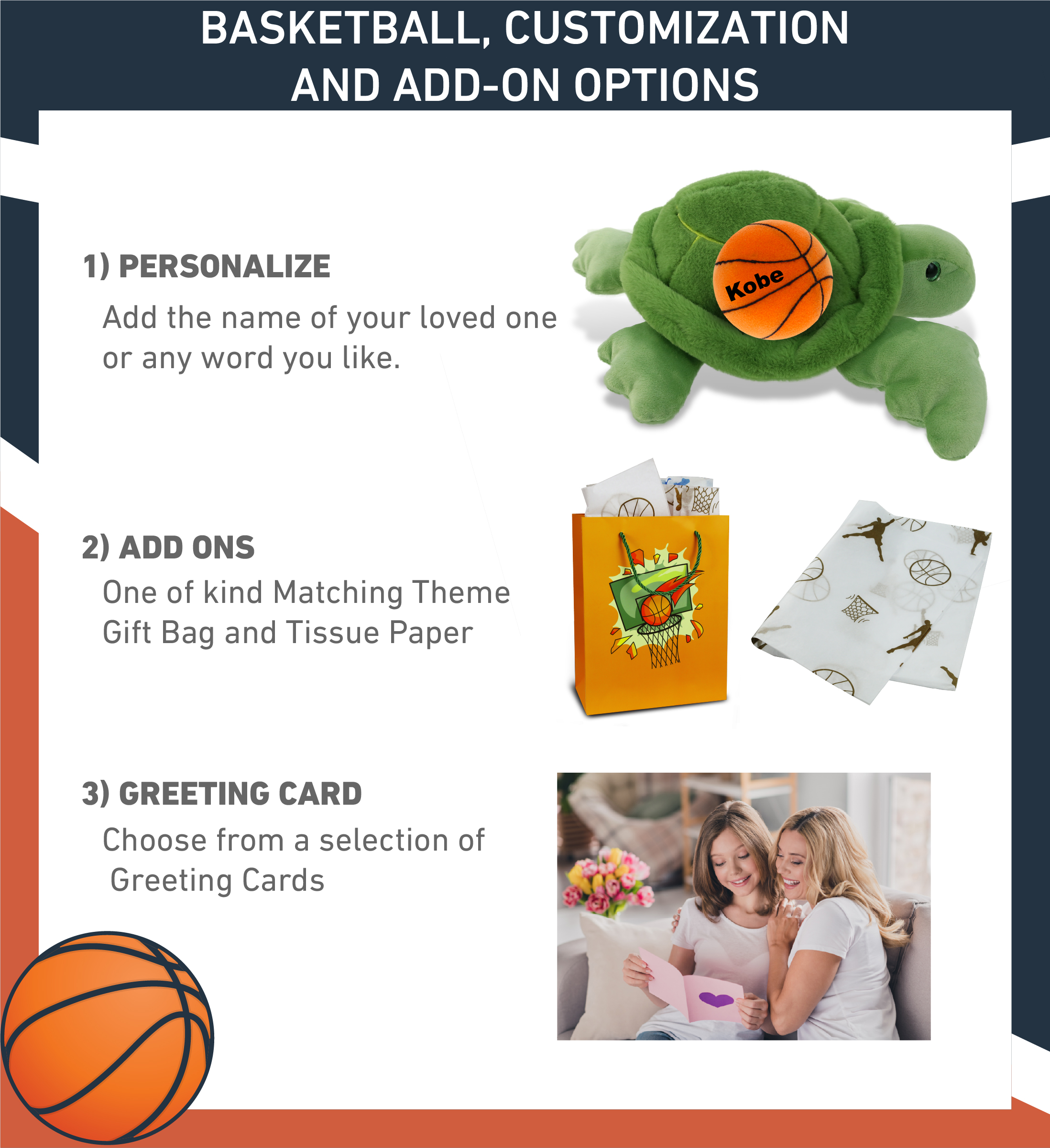 - Personalization, Customization, and Add-on Options – The Super Soft Sports Stuffed Animal Green Sea Turtle comes customized with a basketball plush. You can personalize your sea turtle plush toy with the name of your loved one, which we will imprint on the item. You also have the option to add some or all of the cool add-ons to make your plush gift extra special: 1) Gift Bag; 2) Tissue Paper; 3) Greeting Card.