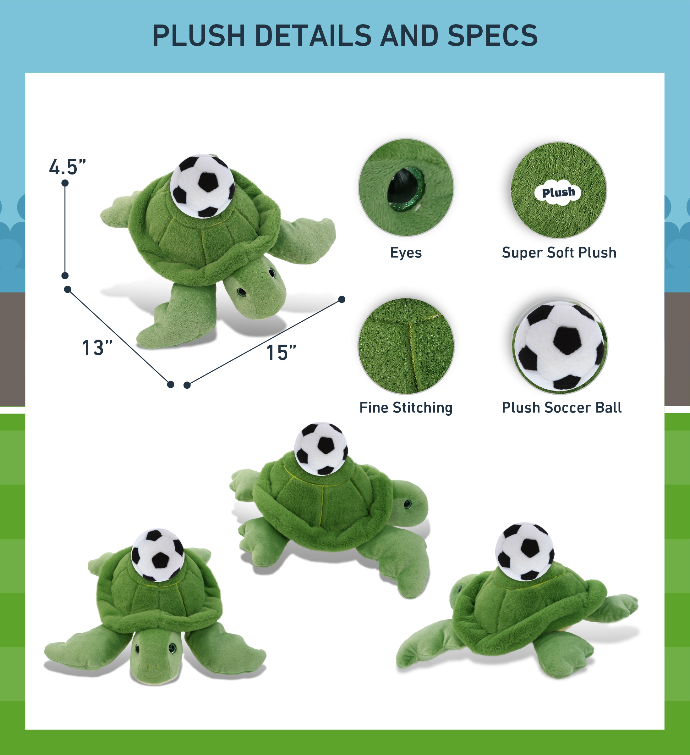 - Included with the Purchase of Adorable and Cute Sea Turtle Plush – Includes 1 DolliBu Green Sea Turtle Super Soft Plush with a soccer ball plush, decorated with realistic features of a cute turtle. The sea turtle’s body with a sports gift ball plush makes the plush perfect for cuddles. The plush toy displays the realistic features of a turtle. The eyes make the critter so charming. The cute plush toy buddy measures 13LX15WX4.5H inches.