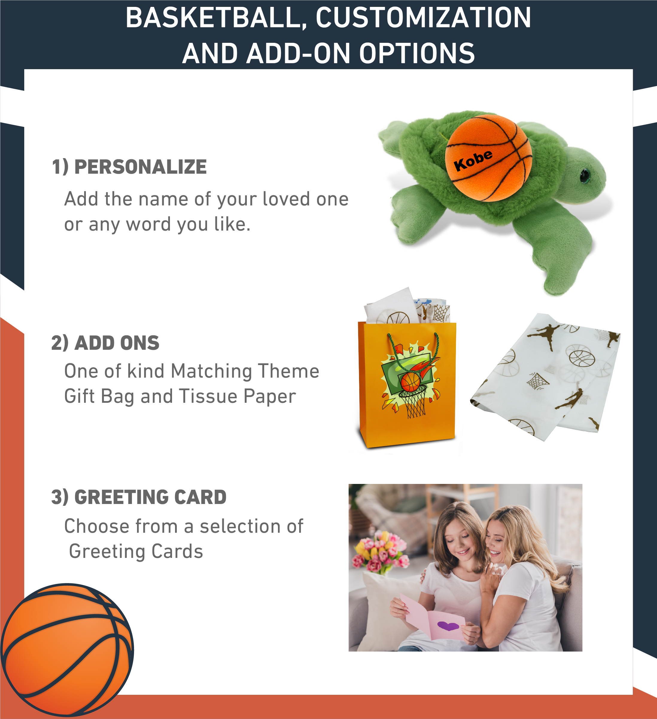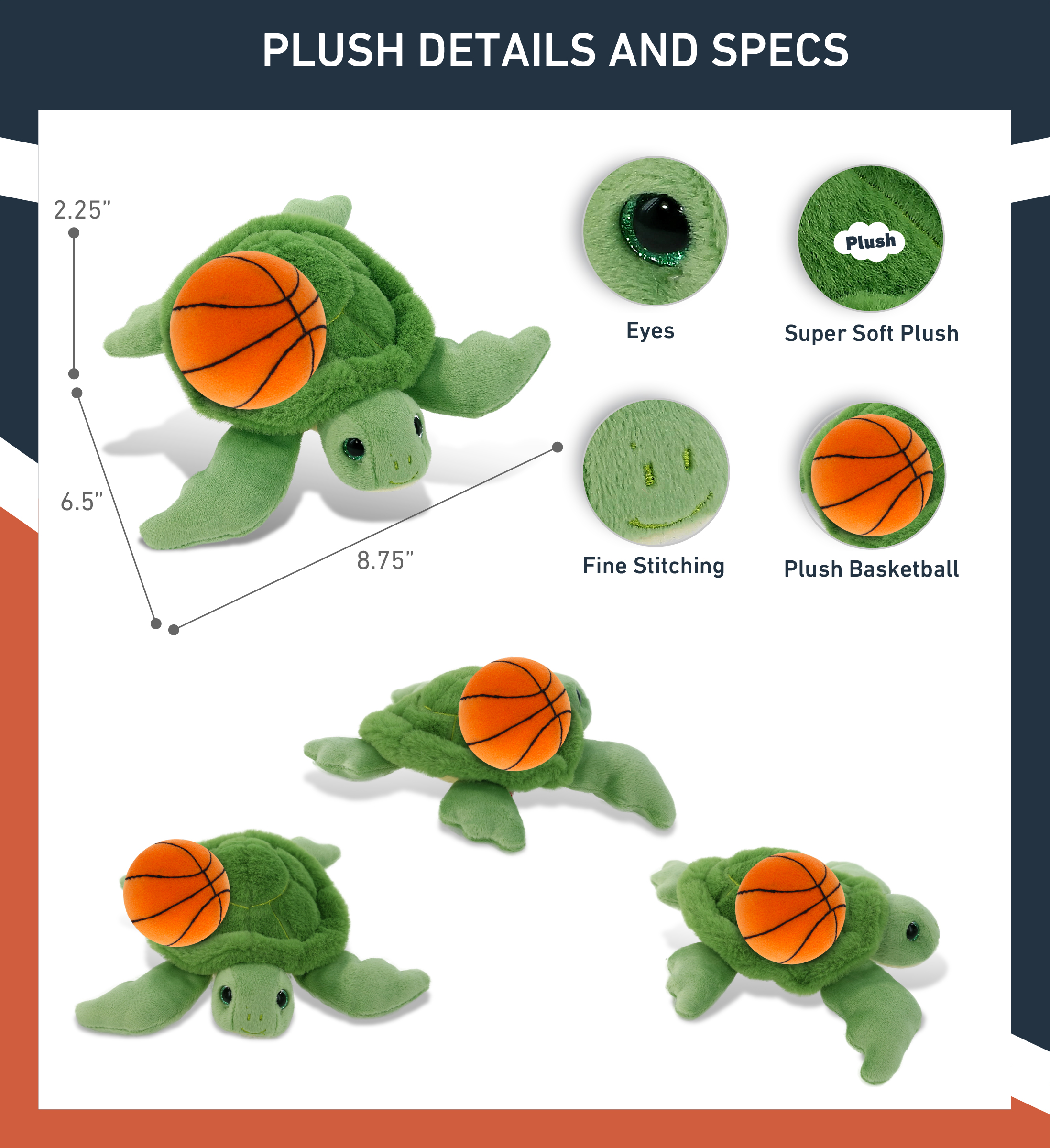 - Personalization, Customization, and Add-on Options – The Super Soft Sports Stuffed Animal Green Sea Turtle comes customized with a basketball plush. You can personalize your sea turtle plush toy with the name of your loved one, which we will imprint on the item. You also have the option to add some or all of the cool add-ons to make your plush gift extra special: 1) Gift Bag; 2) Tissue Paper; 3) Greeting Card.