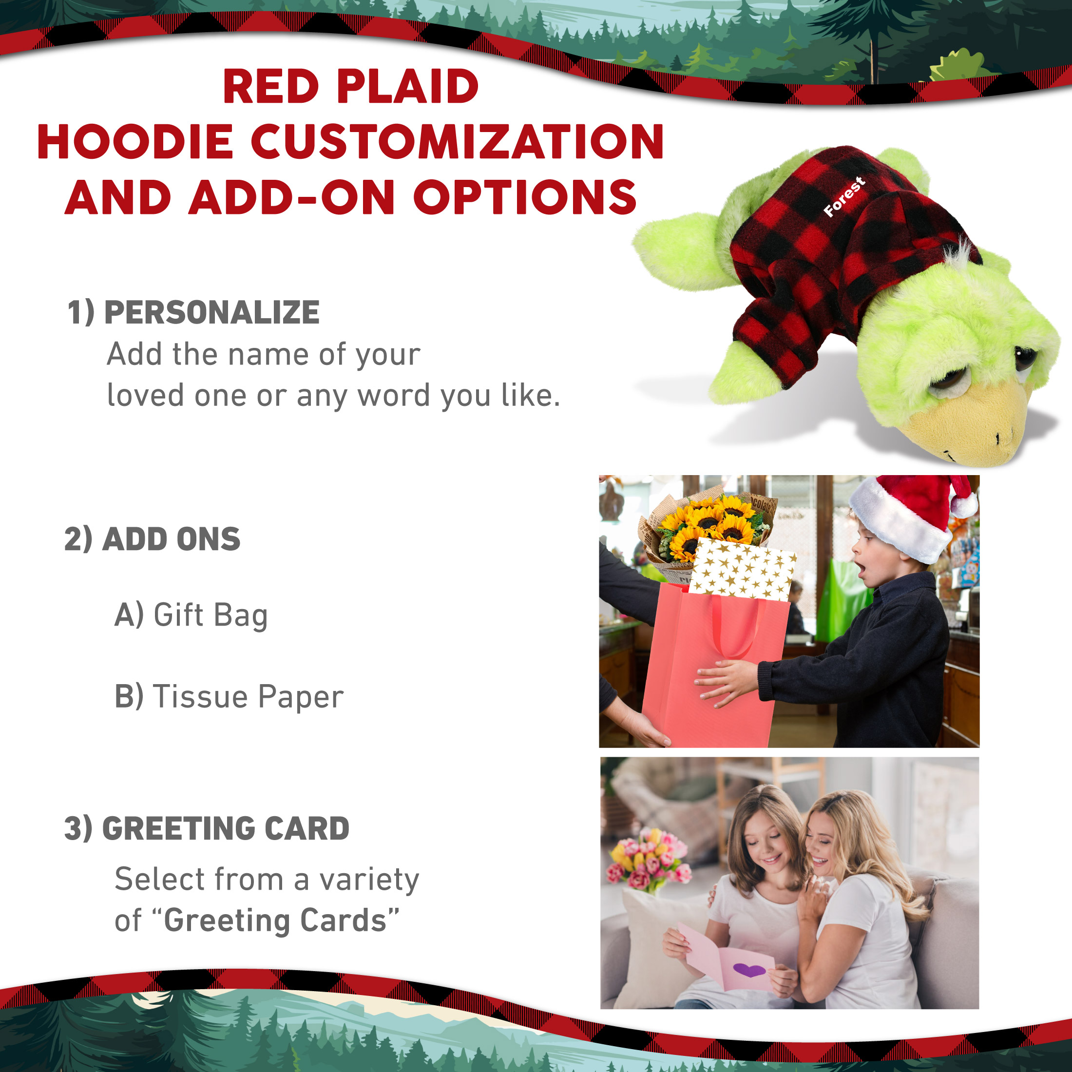 - Personalization, Customization, And Add-On Options – The Super Soft Large Green Sea Turtle Stuffed Animal comes dressed in a cozy teddy bear costume, a red plaid hoodie. Make your turtle plush more special and personalize it with the name of your loved one, which we will print onto the plush. You can also customize your plush turtle by adding any of our unique add-ons to create the perfect gift: 1) Gift Bag 2) Tissue Paper 3) Greeting Card.