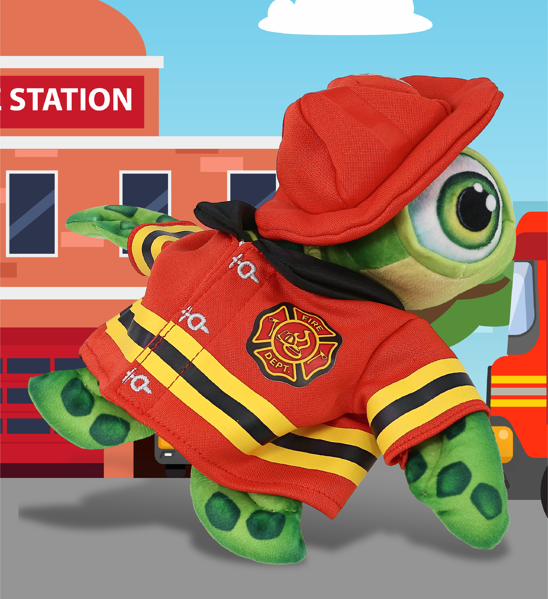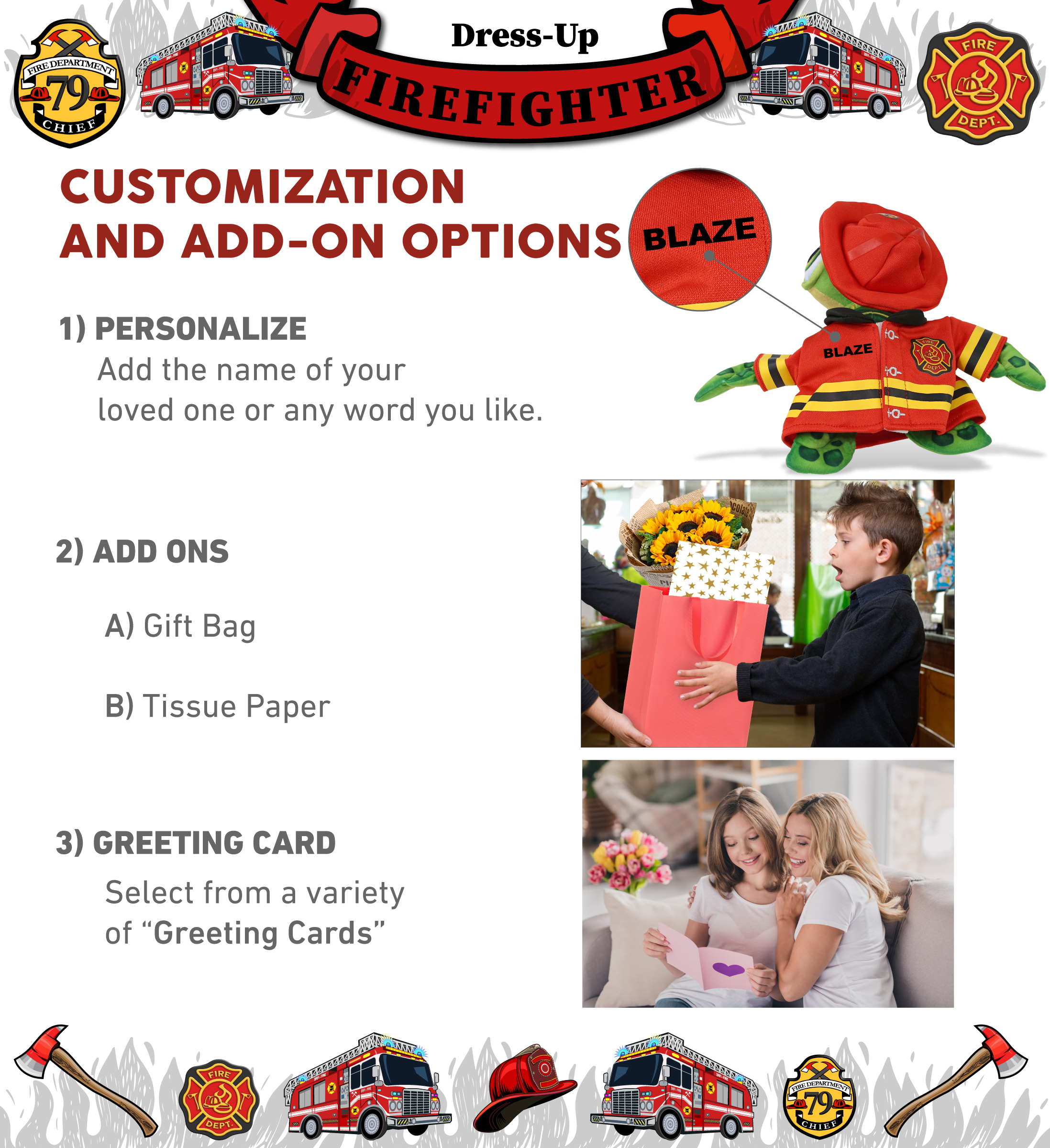 • Personalization, Customization, And Add-On Options – Green Sea Turtle firefighter plush features a red fireman toy costume wearing a firefighter hat, jacket, and pants. Personalize your plush firefighter toys with the name of your loved one, which we will imprint on the item. You also have the option to customize your fireman plush by adding some or all of our cool add-ons to make it extra special: 1) Gift Bag 2) Tissue Paper 3) Greeting Card.