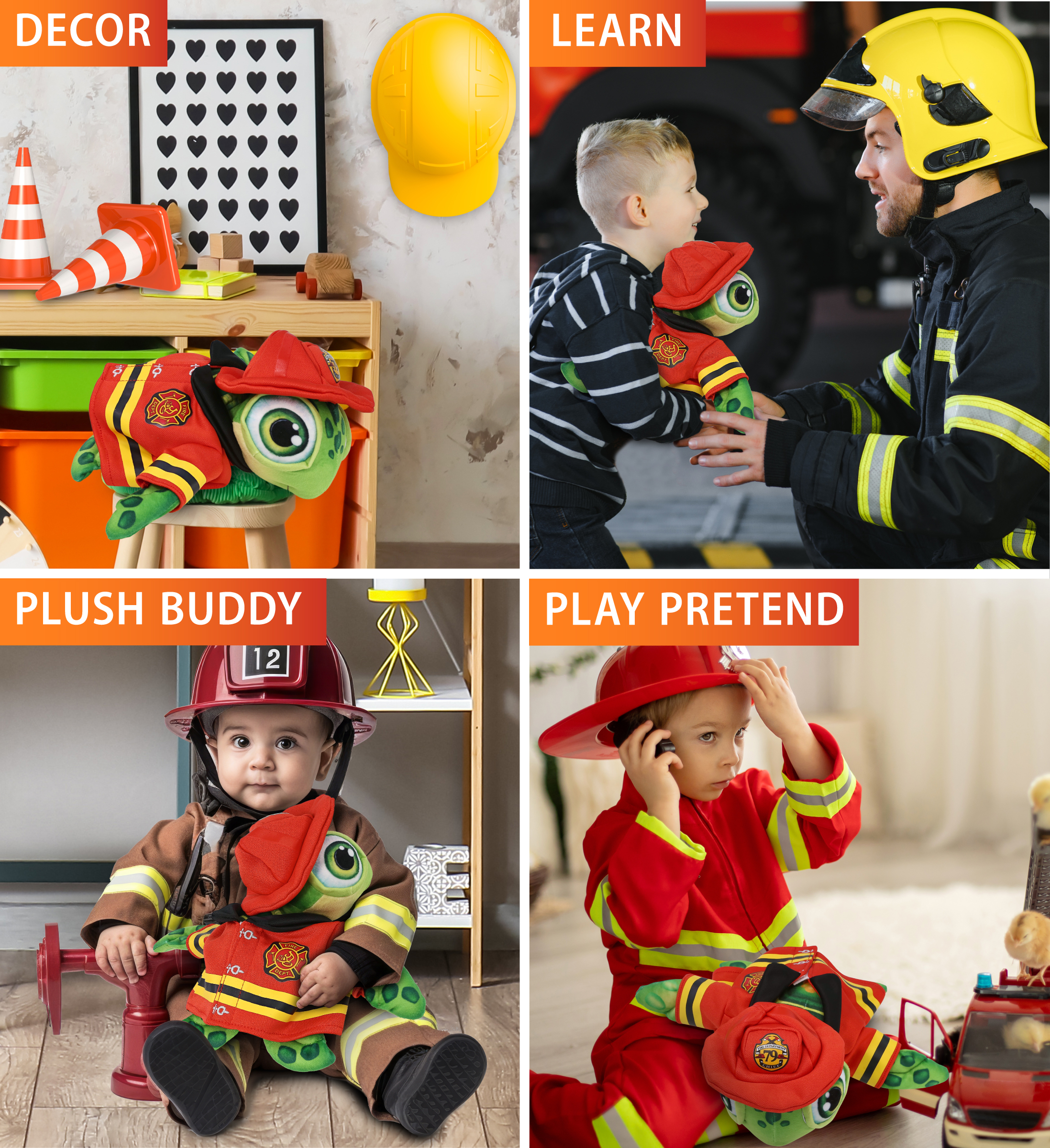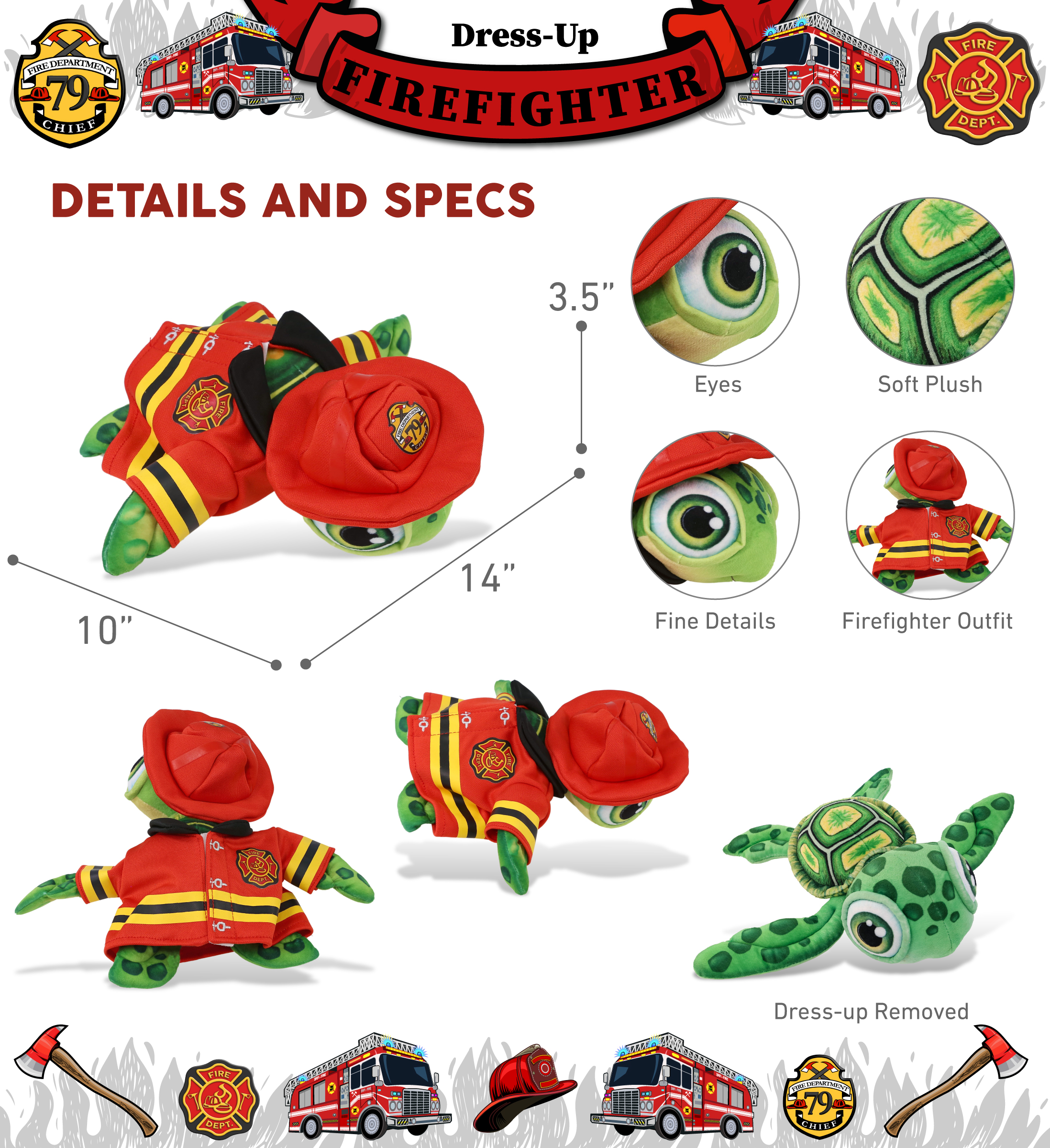 • Included with The Purchase of Firefighter Doll – Includes 1 Plush Buddies Green Sea Turtle plush toy with fireman plush animal outfit. The turtle is dressed in a realistic firefighter outfit with hat, jacket, pants with yellow and black stripes, and fire dept. patch. Pair your firefighter plush with your firetruck plush toy for fun pretend play. Each fire fighter toys’ measures 10Lx14Wx3.5H inches. Ideal fireman kids stuffed animal age 0 and up.