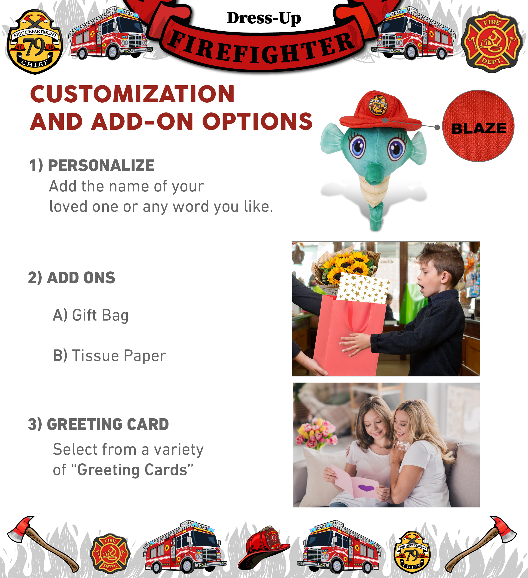 • Personalization, Customization, And Add-On Options – Super Soft Plush Buddies Green Seahorse firefighter plush features a red fireman toy costume wearing a firefighter hat. Personalize your plush firefighter toys with the name of your loved one which we will imprint on the item. You also have the option to customize your fireman plush by adding some or all of our cool add-ons to make it extra special: 1) Gift Bag 2) Tissue Paper 3) Greeting Card.