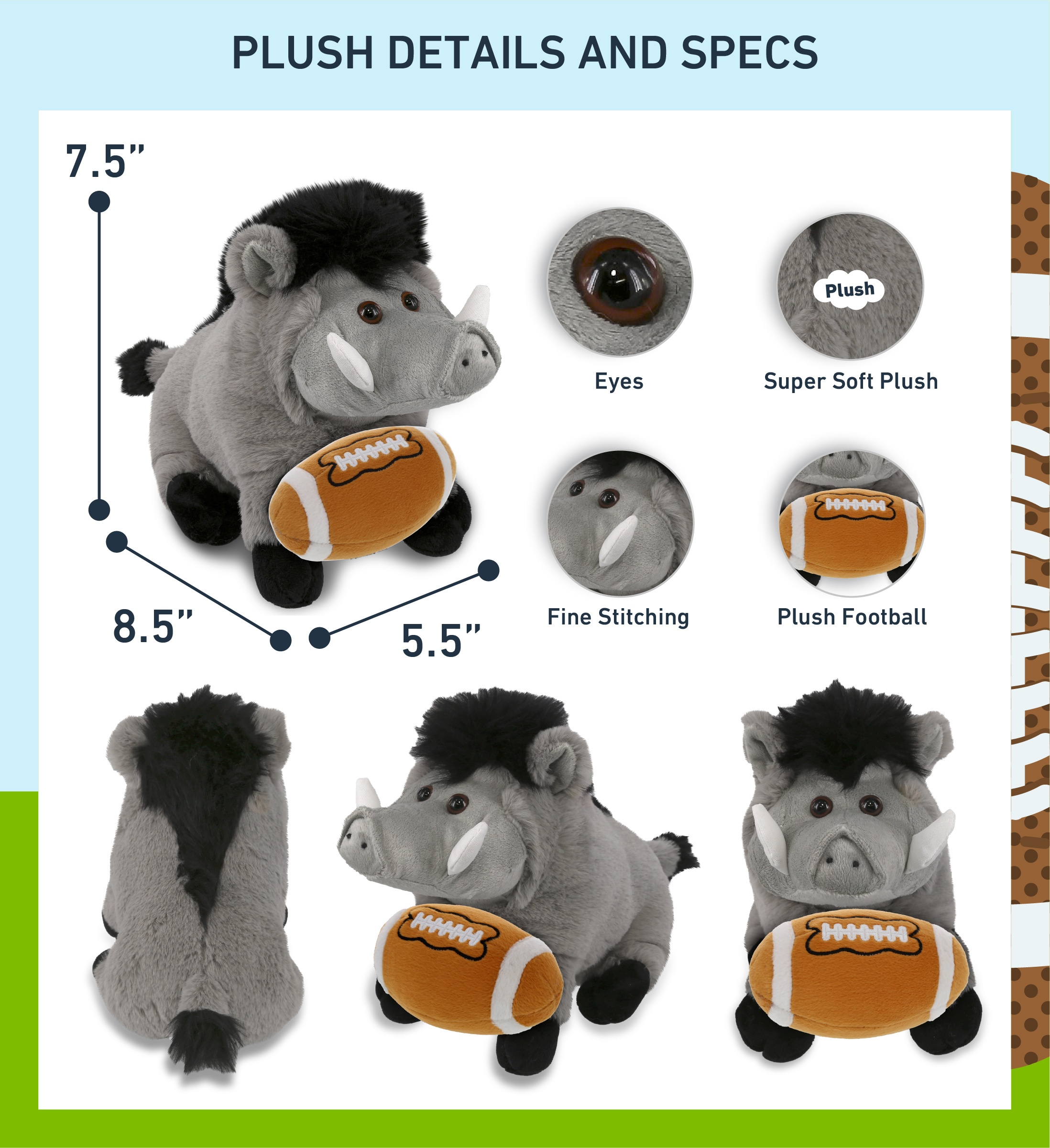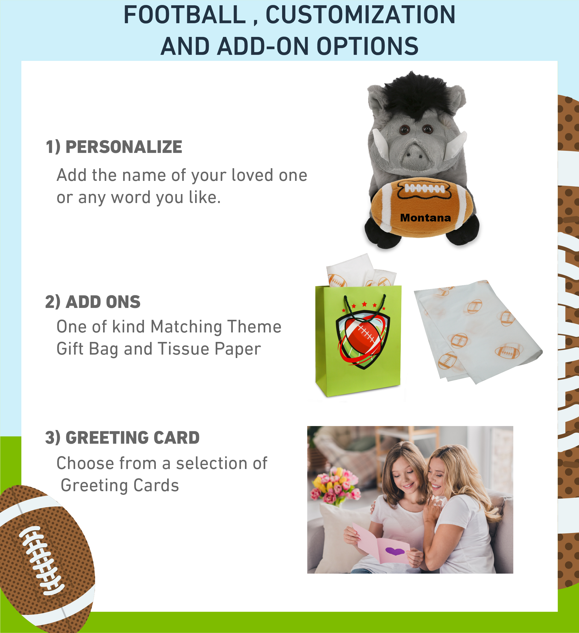 - PERSONALIZATION, CUSTOMIZATION, AND ADD-ON OPTIONS – Super Soft Sports Stuffed Animal Grey Boar comes customized with a Football Plush. You can personalize it with the name of your loved one imprinted on the item. You also have the option to add some or all of the cool add-ons to make your gift extra special: 1) Gift Bag; 2) Tissue Paper; 3) Greeting Card.