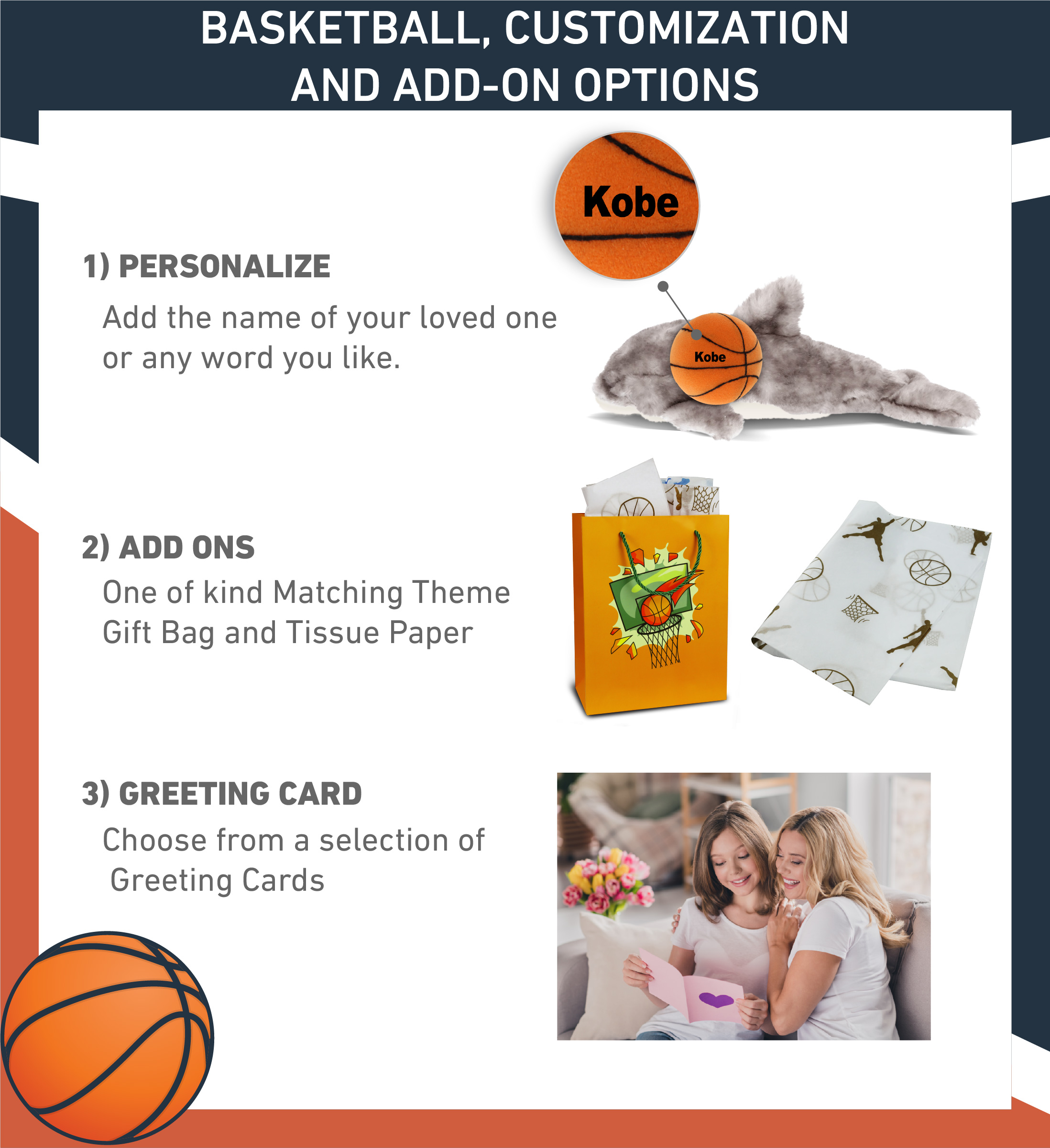 - Personalization, Customization, and Add-on Options – The Super Soft Sports Stuffed Animal Grey Dolphin comes customized with a basketball plush. You can personalize your dolphin plush toy with the name of your loved one, which we will imprint on the item. You also have the option to add some or all of the cool add-ons to make your plush gift extra special: 1) Gift Bag; 2) Tissue Paper; 3) Greeting Card.