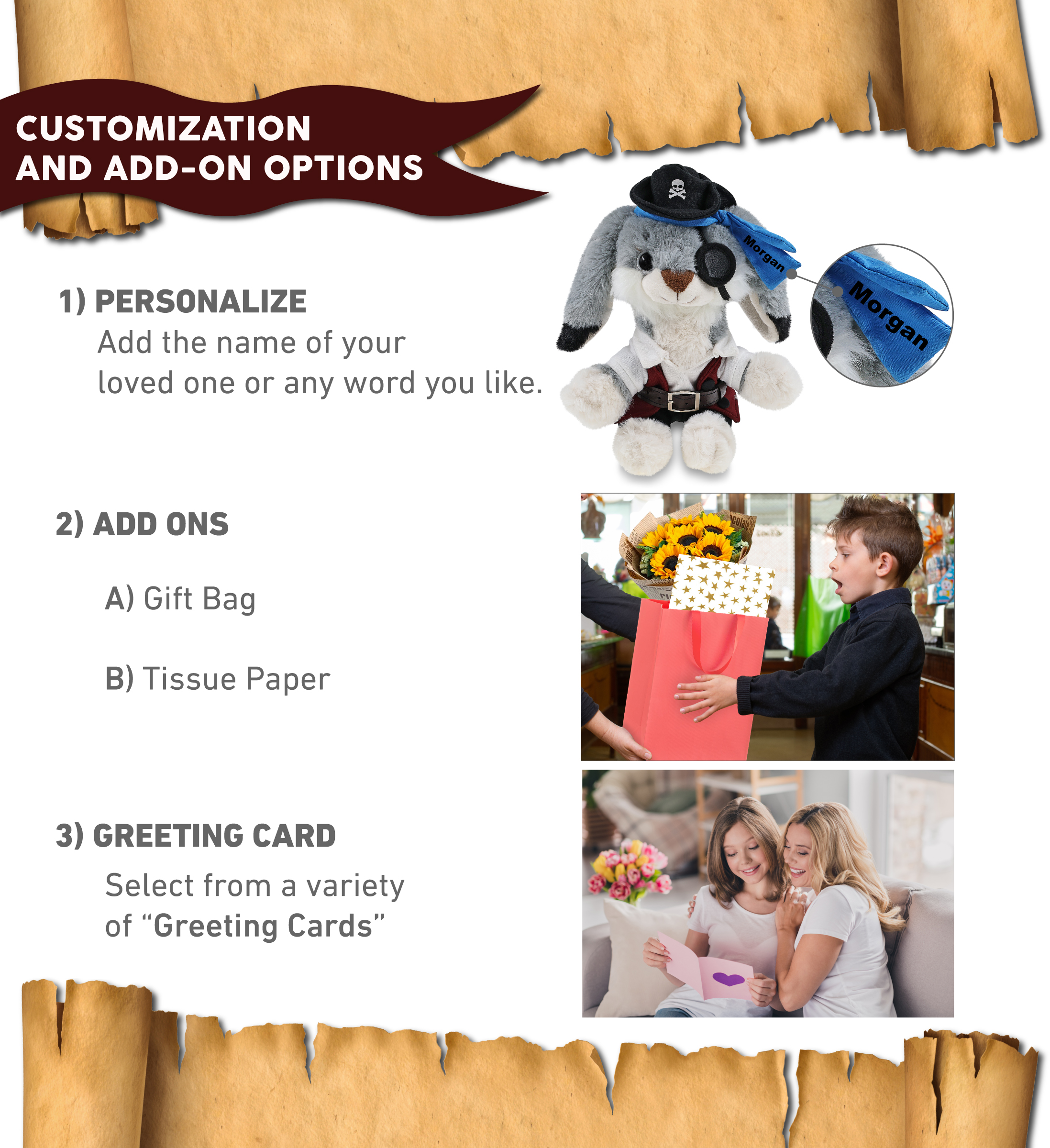 - Personalization, Customization, and Add-On Options – The rabbit figure stuffed toy comes dressed in full pirate clothes, complete with pirate hat, pirate vest, pirate shirt, pants, belt, and pirate mask. Make your bear doll special by adding a personalized name, which we will imprint onto the plush. You can also customize your stuffed animal by adding any of our add-ons to create the perfect gift: 1) Gift Bag 2) Tissue Paper 3) Greeting Card.