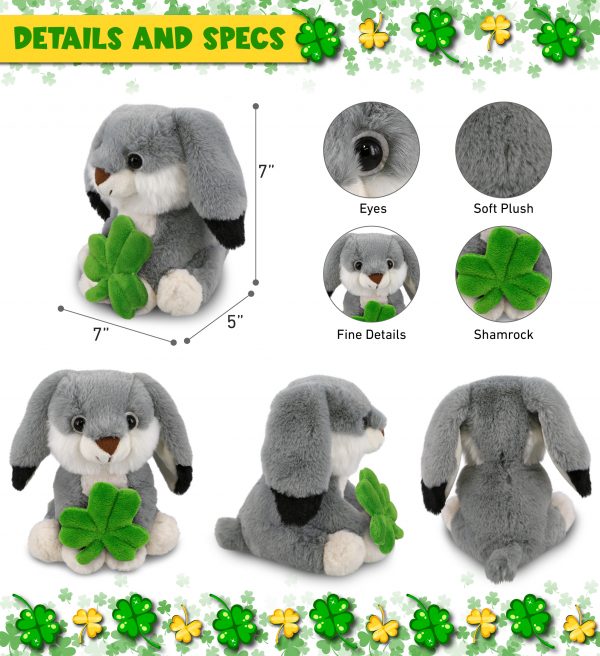 - THE SHAMROCK PLUSH GREY RABBIT IS FOR EVERYONE WHO LOVES STUFFED ANIMALS – The plush stuffed animal rabbit toy with an Irish shamrock is for everyone looking for cute stuffed animals to celebrate St Patricks Day. Perfect for Saint Patricks Day decor or cool prizes on St Patricks Day Games. Let the good and fun times roll with the grey rabbit with a green plush shamrock; cute green St Patricks Day Gift to give this festive season.