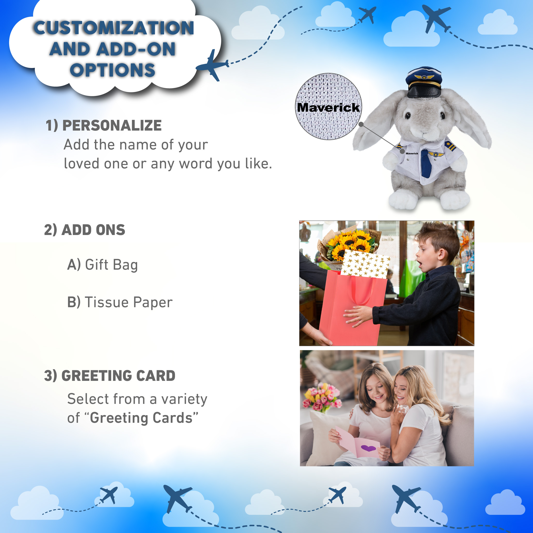 - Personalization, Customization, and Add-On Options – The rabbit stuffed animal comes dressed in a full pilot outfit set, with a white pilot shirt, captain hat, belt, and pants. Make your pilot stuffed bear special by adding a personalized name, which we will imprint onto the plush. You can customize your plush pilot toy by adding any of our add-ons to create the perfect gift: 1) Gift Bag 2) Tissue Paper 3) Greeting Card.