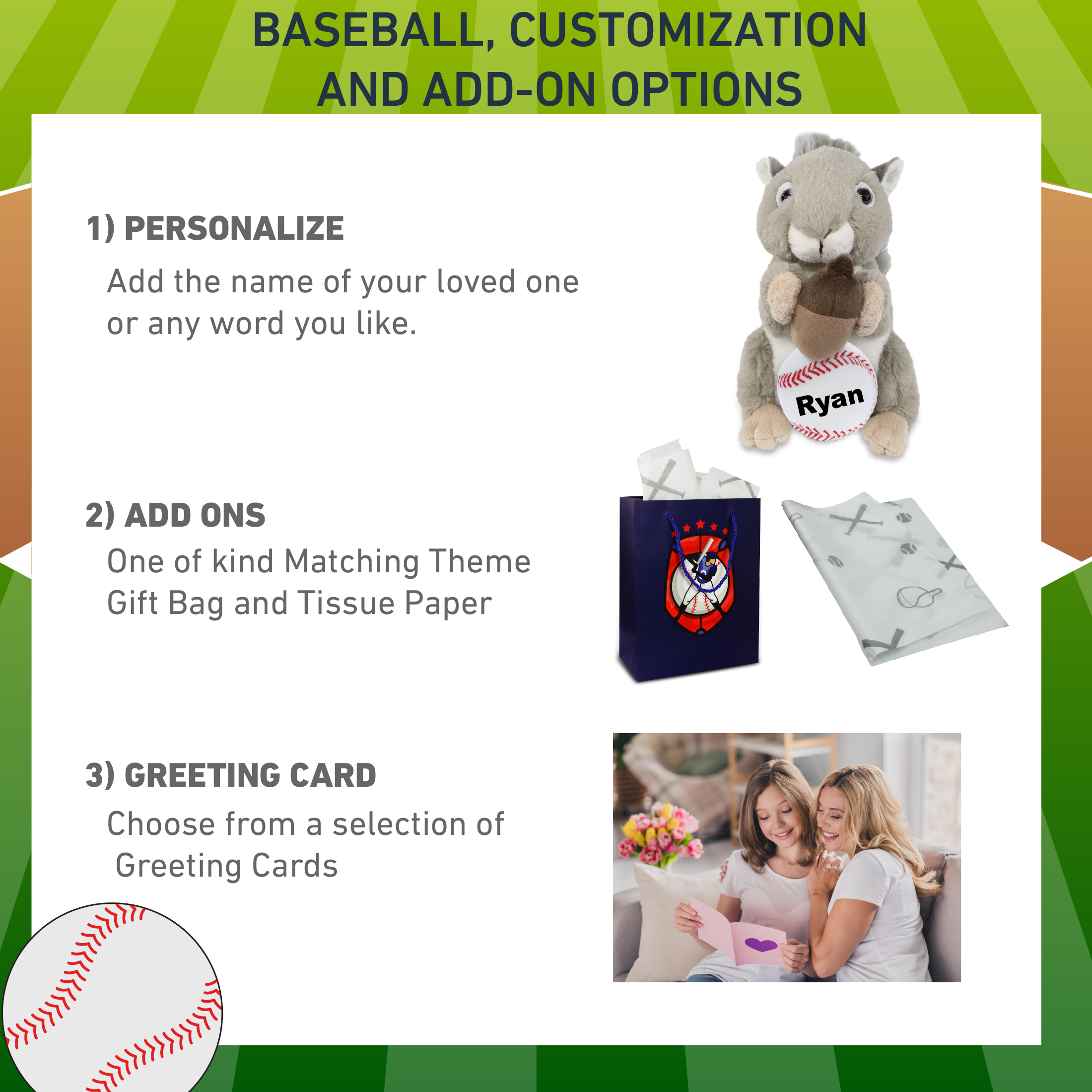- Personalization, Customization, and Add-On Options – The Super Soft Sports Stuffed Animal Grey Squirrel comes customized with a small baseball plush. You can personalize your stuffed animal squirrel with the name of your loved one which we will imprint on the item. You also have the option to add some or all of the cool add-ons to make your gift extra special: 1) Gift Bag; 2) Tissue Paper; 3) Greeting Card.