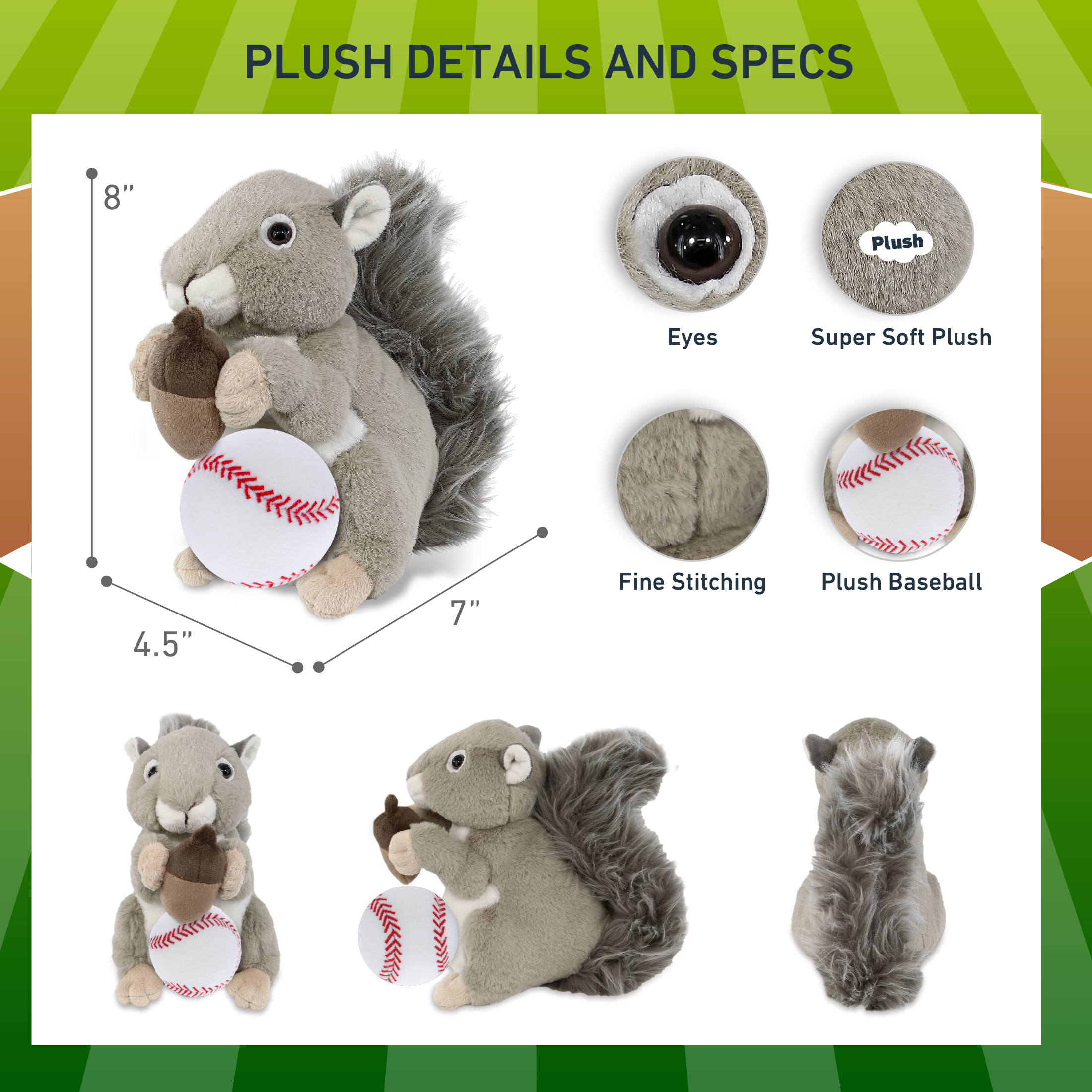 - Included with The Purchase of Grey Squirrel Plush with Baseball Ball – Includes 1 DolliBu Grey Squirrel Super Soft Stuffed Animal with a baseball plush, decorated with realistic features of a squirrel. The baseball sports ball is attached to the squirrel’s body, making it perfect for cuddles. The squirrel plush toy features realistic details. The squirrel’s eyes make the critter so charming. The cute plush toy buddy measures 7Lx4.5Wx8H inches.