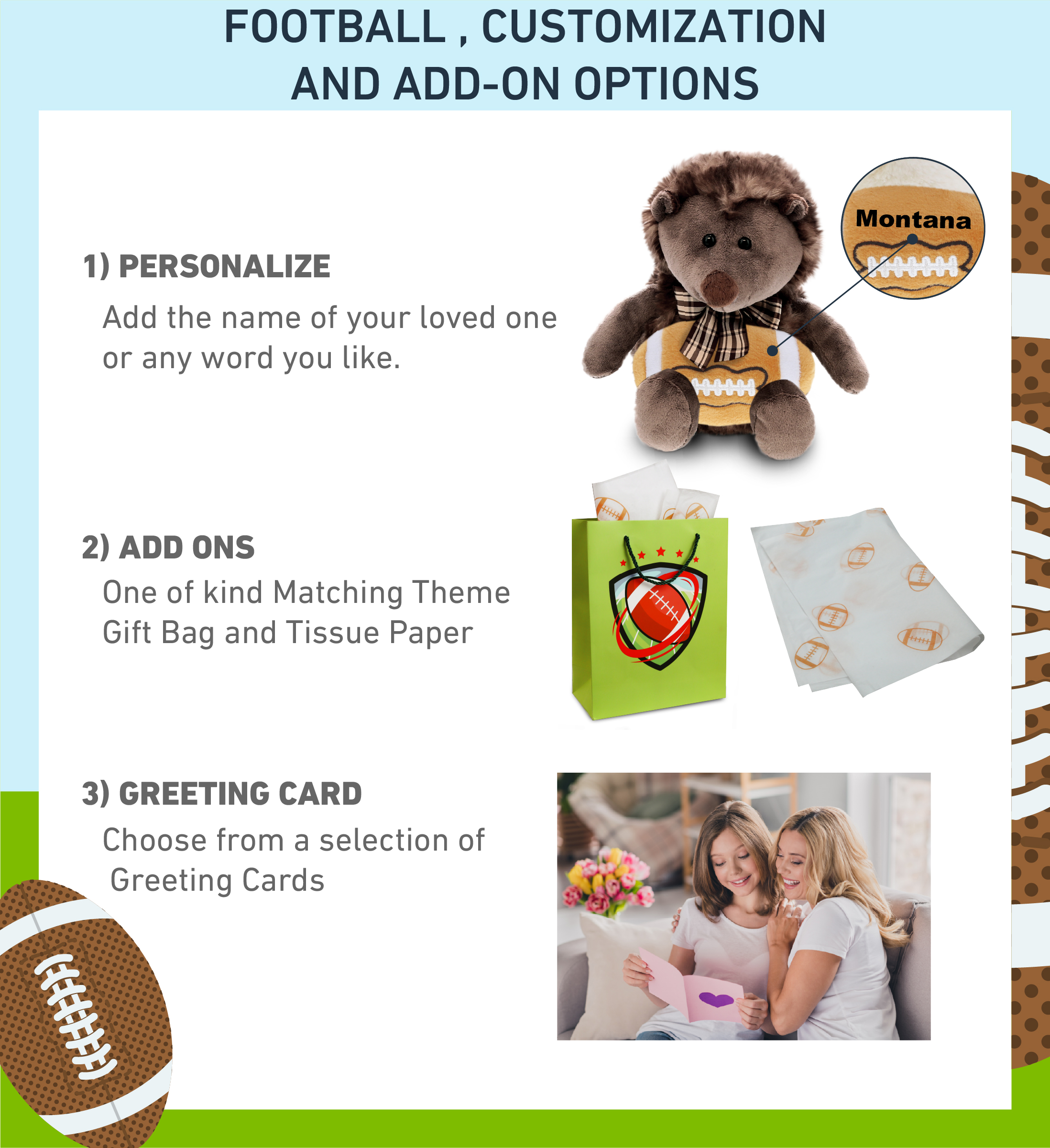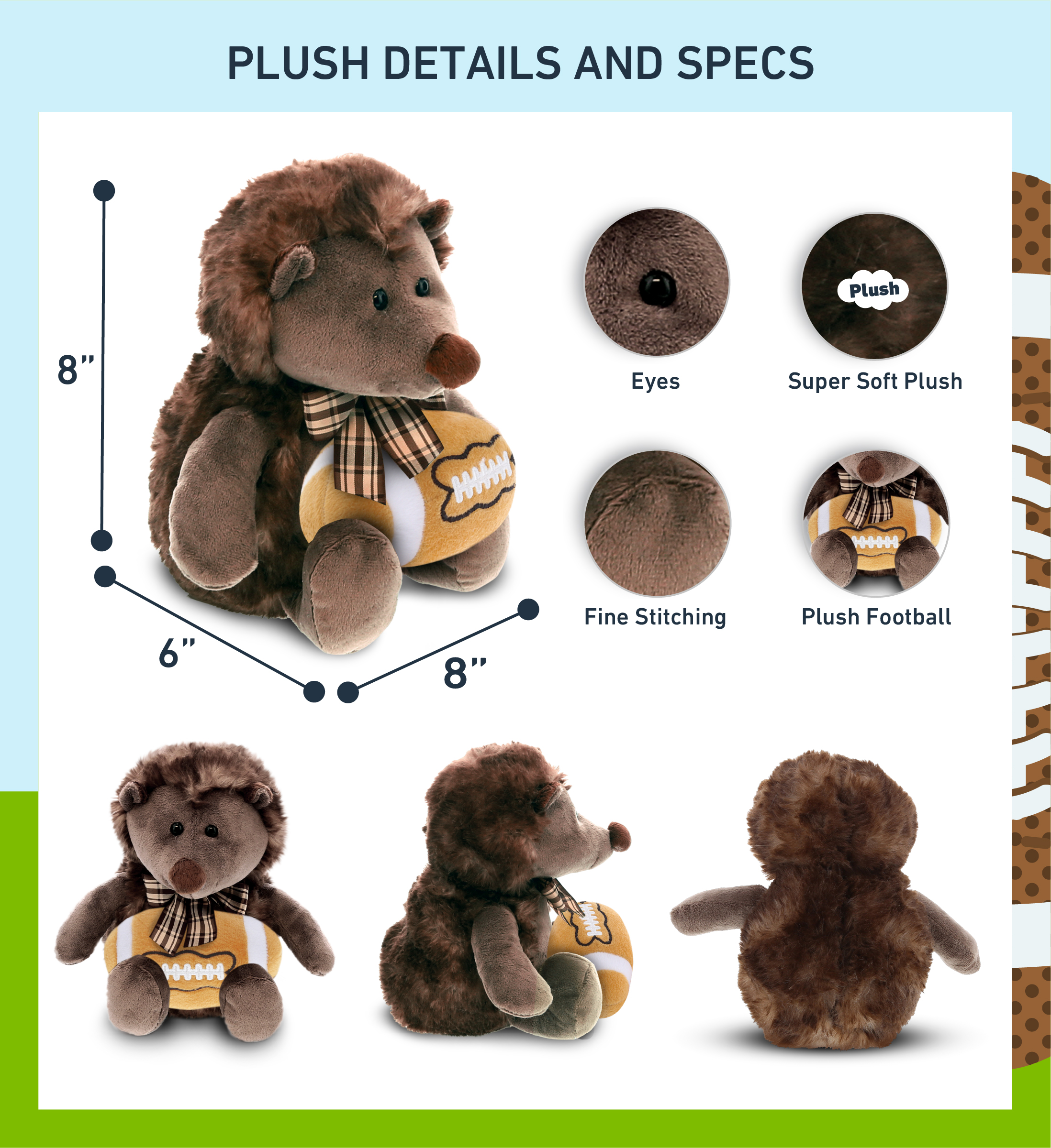 - Personalization, Customization, and Add-On Options – This Super Soft Sports Stuffed Animal Hedgehog with Ribbon Plush comes customized with a football plush. You can personalize it with the name of your loved one imprinted on the item. You also have the option to add some or all of the cool add-ons to make your gift extra special: 1) Gift Bag; 2) Tissue Paper; 3) Greeting Card.