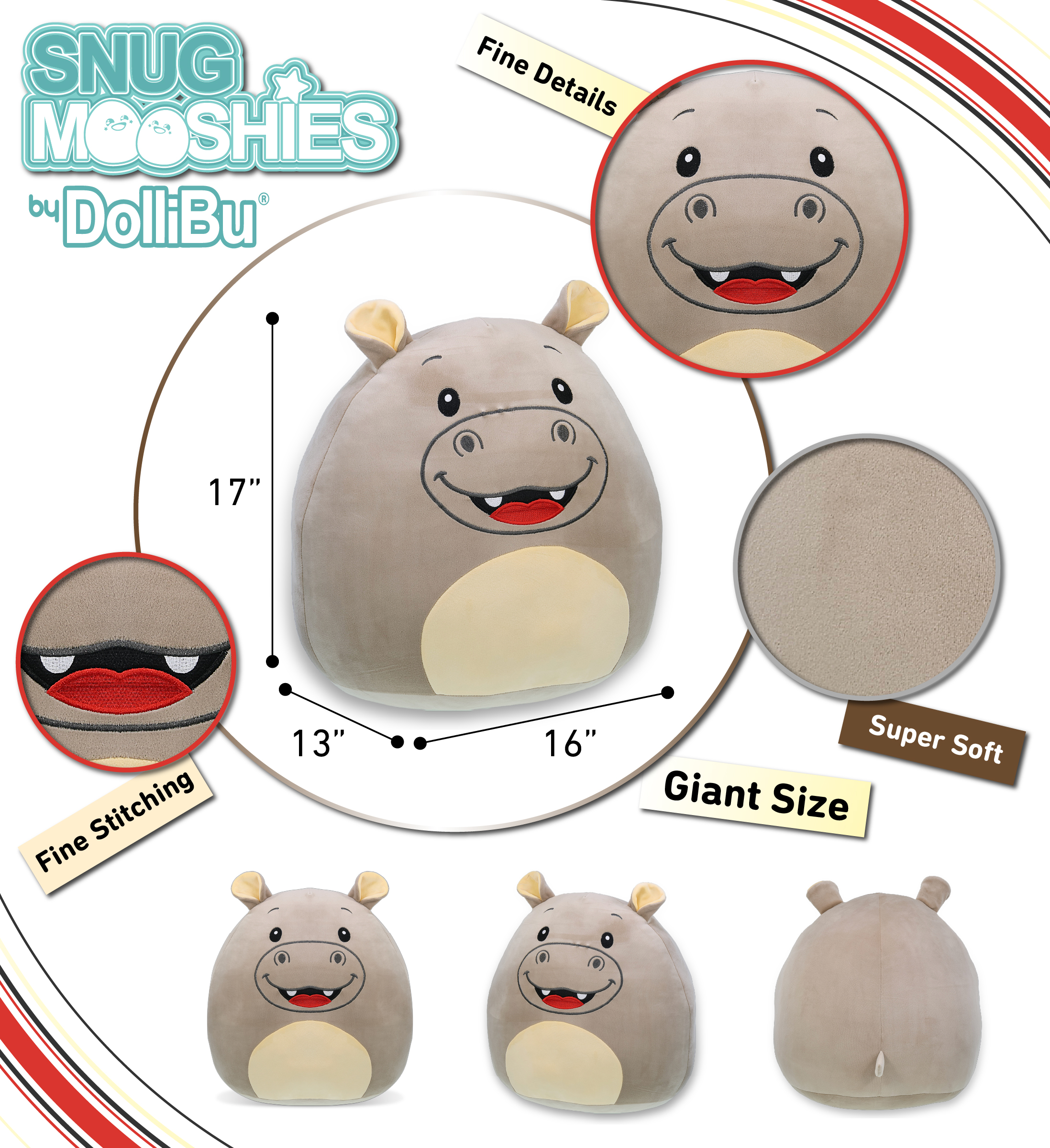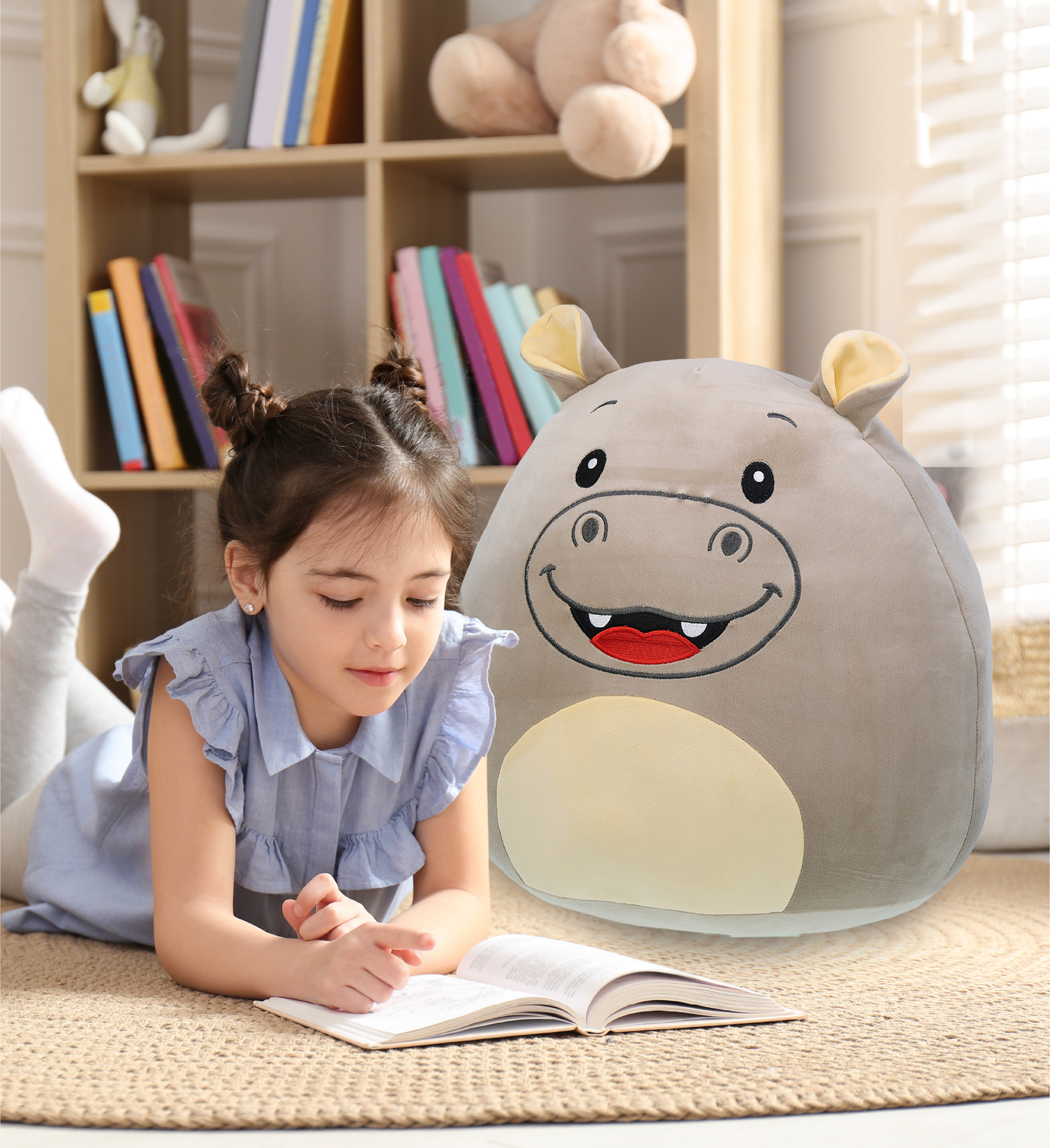 This Big DolliBu Snug-Mooshies Hippo plush pillow is designed for teens, kids, and adults. It can be used for lounging, resting, or displaying in bedrooms, playrooms, and reading areas. The large pillow-style plush size makes it suitable for beds, sofas, and floor seating. It can be added to wild animal plush collections or used as a decorative animal pillow plush. The Snug-Mooshies Hippo plush features a wide, rounded pillow body with a soft plush exterior and embroidered facial details inspired by wild animals. It is filled with a squishy stuffing material that provides a cushion-like structure for resting and lounging. The plush is designed for holding, squeezing, and leaning against. Its oversized shape allows for comfortable support and placement. The Snug-Mooshies Hippo plush pillow is made with 100% polyester materials. It is crafted with embroidered features. The plush exterior provides a smooth and soft surface texture. For care, wash with cold soapy water and allow to air dry. Includes 1 DolliBu Large Snug-Mooshies Hippo plush pillow. The plush measures approximately 16Lx13Wx17H inches. The large form makes it suitable for hugging, resting, and lounging. Designed for indoor use and everyday handling. Recommended for ages 3 years and up.