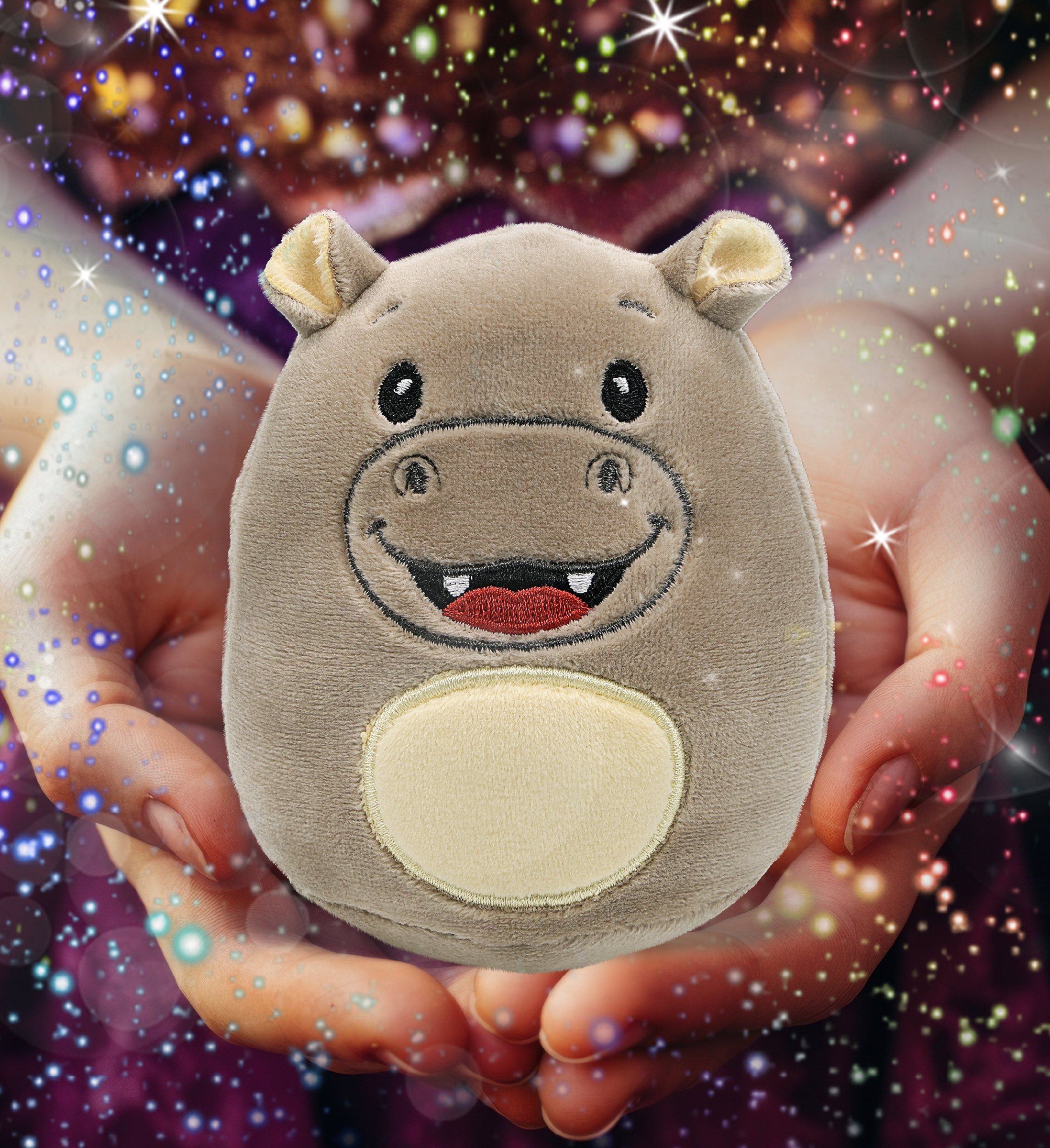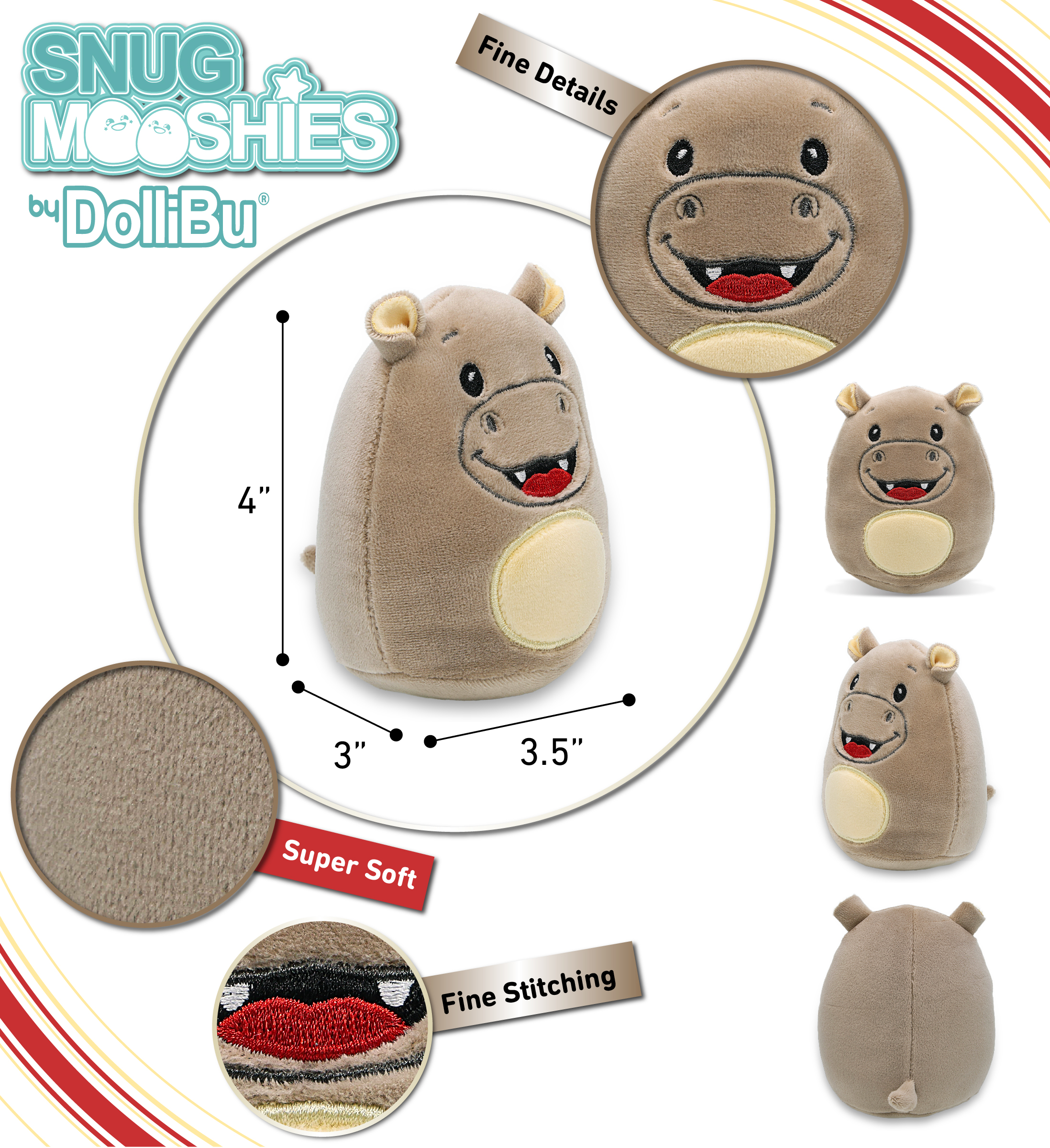 - This Plush Hippo Snug-Mooshies Measures Approximately 3.5Lx3Wx4H Inches – This stuffed hippo is designed with a compact rounded body that is easy to hold, squeeze, and display. The size is suitable for small hands and fits well on shelves, desks, or bedside tables. The plush hippo shape allows for comfortable handling during play or display. Intended for indoor use and collection.