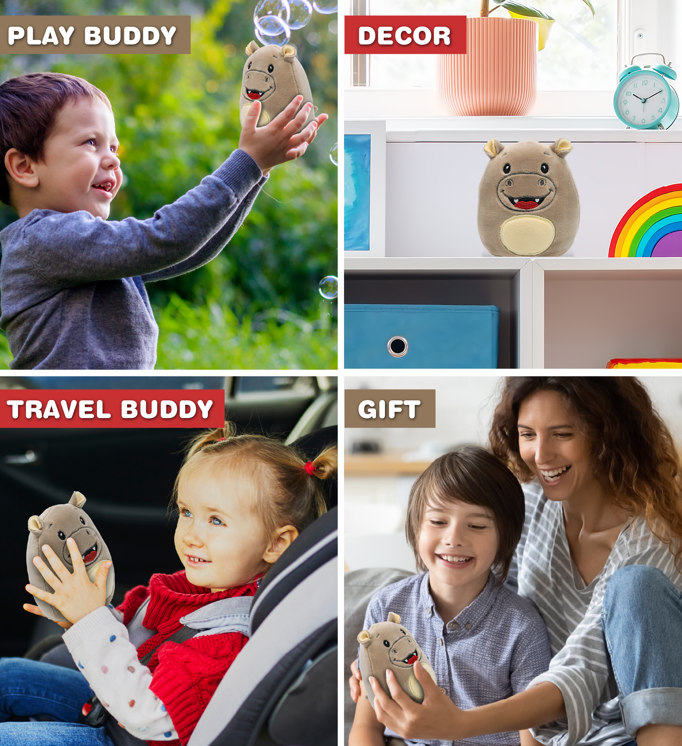 - Features a Soft Plush Hippo Stuffed Animal – The Snug-Mooshies Hippopotamus Plush is structured with a rounded body shape and a soft plush exterior. Features embroidered facial details with a hippo-inspired look. The squishy filling of this stuffed hippopotamus provides a gentle, cushion-like structure. The compact form makes it easy to hold and display along other wild animal toys.