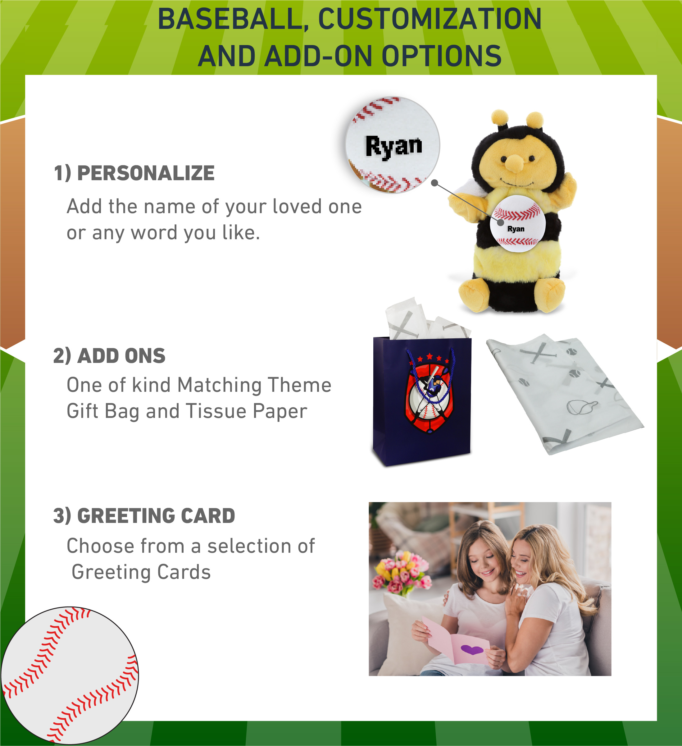 - Personalization, Customization, and Add-On Options – The Super Soft Sports Stuffed Animal Honeybee Plush Hand Puppet comes customized with a small baseball plush. You can personalize your stuffed animal honeybee with the name of your loved one which we will imprint on the item. You also have the option to add some or all of the cool add-ons to make your gift extra special: 1) Gift Bag; 2) Tissue Paper; 3) Greeting Card.