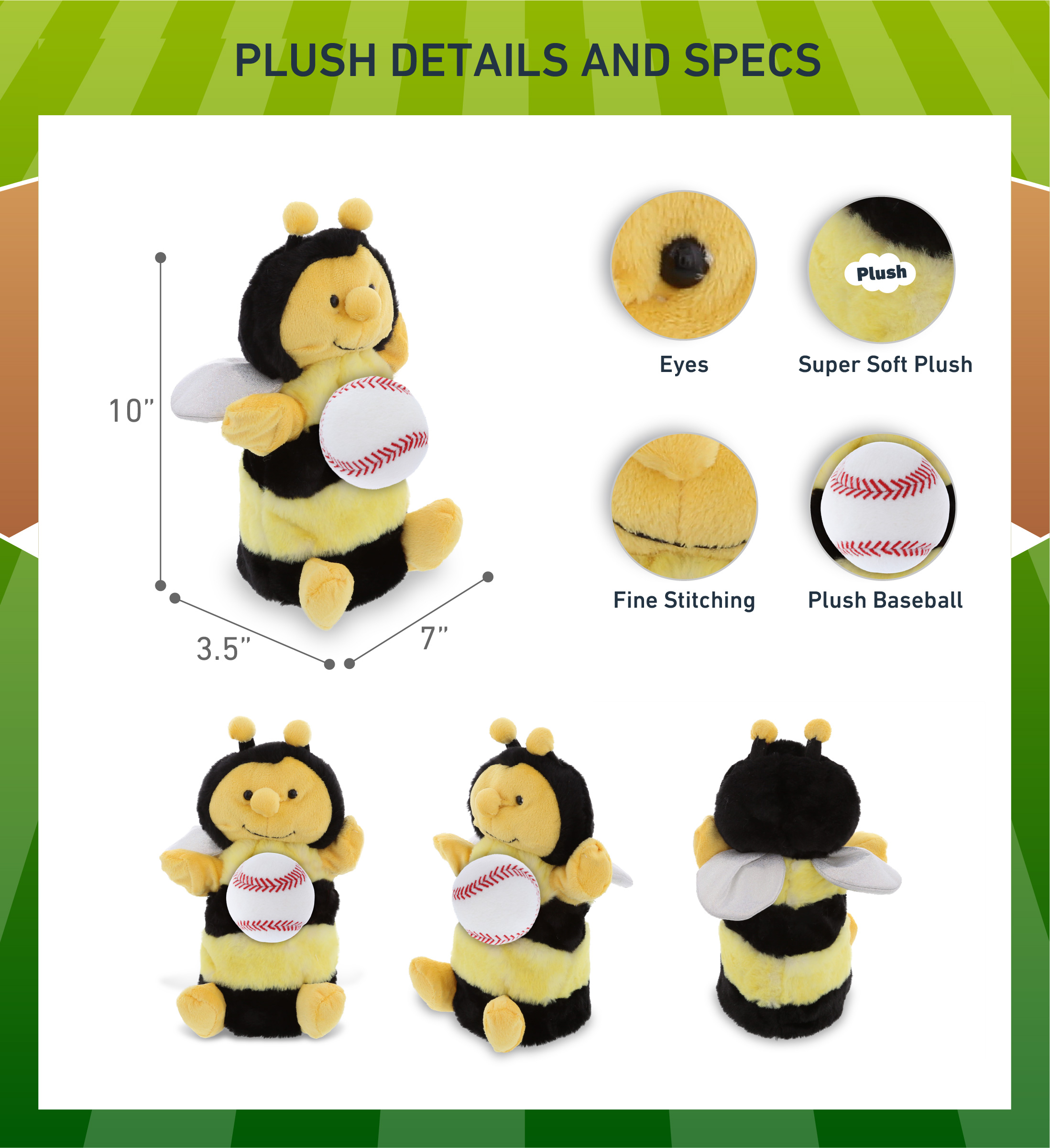 - Included with The Purchase of Honeybee Puppet with Baseball Ball – Includes 1 DolliBu Honeybee Super Soft Stuffed Animal Plush Hand Puppet with baseball plush, decorated with realistic features of bee. The baseball sports ball is attached to the honeybee’s body, making it perfect for cuddles. The honeybee plush puppet features realistic details. The honeybee’s eyes make the critter so charming. The cute plush puppet measures 7Lx3.5Wx10H inches.
