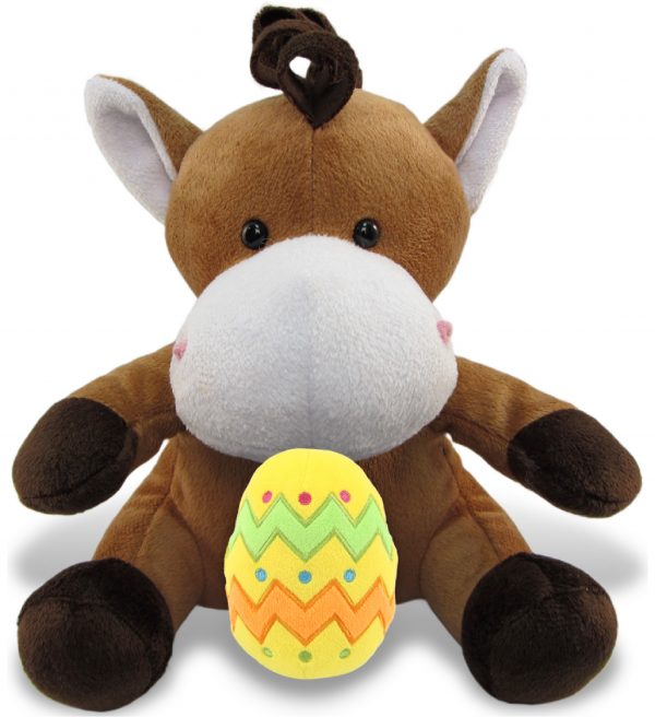 - HIGH-QUALITY EASTER PLUSH FOR GIRLS AND BOYS – Super Soft Plush Horse is a stuffed animal Easter plush made of premium 100% polyester. The horse is covered with brown plush, the Easter egg is yellow with zig zags and dots in spring color. Cute stuffed animals for girls and boys crafted with durable materials designed to deliver a Welcome Spring and Easter message. To maintain the horse plush, wash with cold water and allow to air dry.