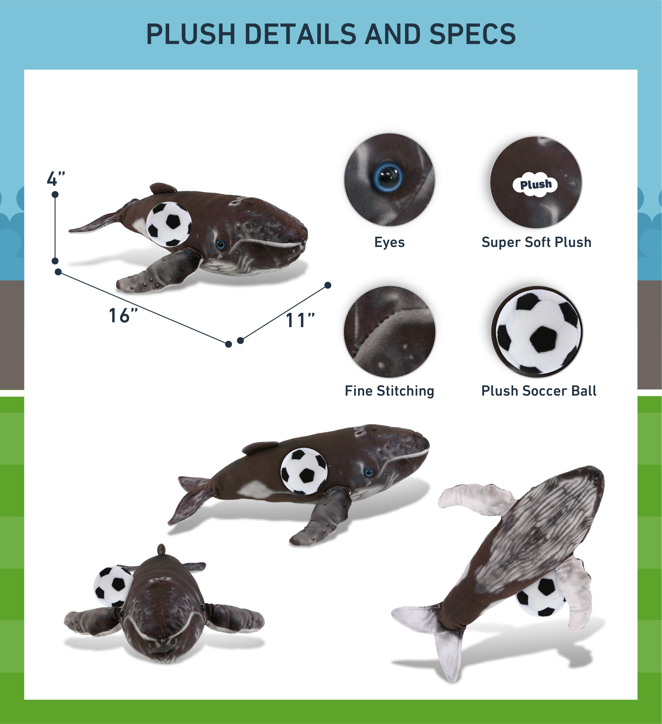 - Included with the Purchase of the Cute Wild Collection Whale Plush – Includes 1 DolliBu Wild Collection Humpback Whale Plush with a soccer ball plush, decorated with realistic features. The whale’s body with a sports gift ball plush makes the plush perfect for cuddles. The whale’s plush toy features details like its characteristic flippers. The whale’s eyes make the critter so charming. The cute whale plush toy buddy measures 16Lx11Wx4H inches.